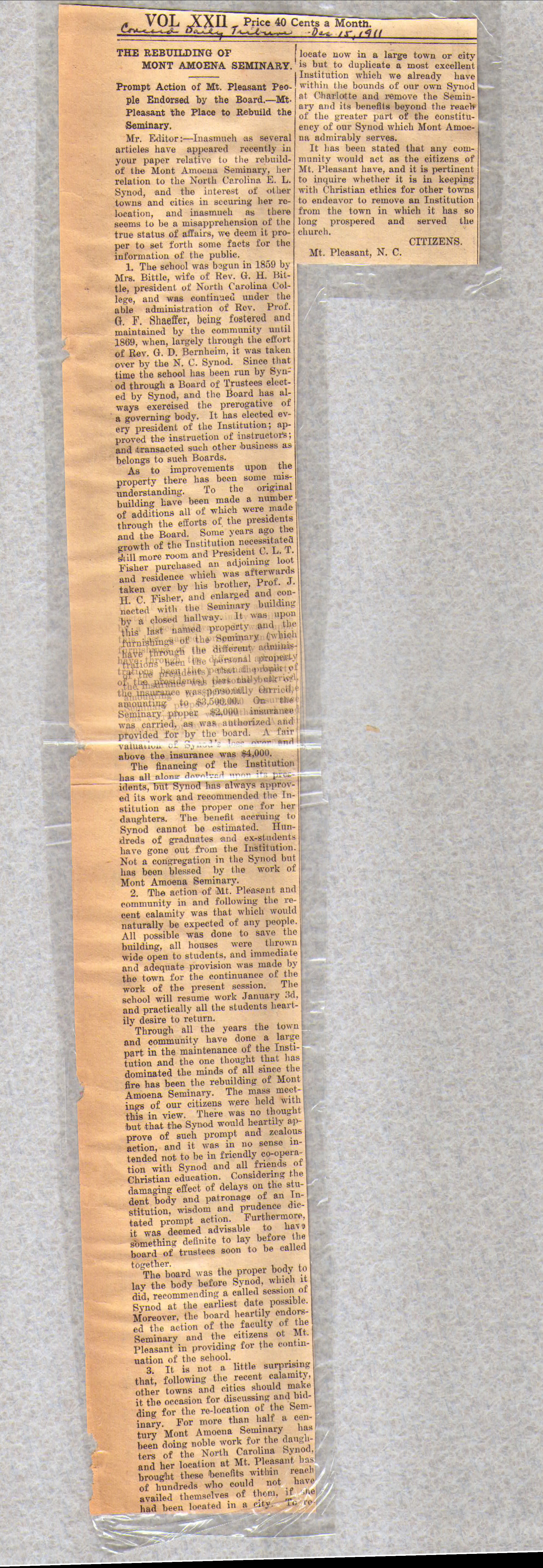 3. It is not a little surprising that, following the recent calamity, other towns and cities should make it the occasion for discussing and bidding for the re-location of the Seminary. For more than half a century Mont Amoena Seminary has been doing noble work for the daughters of the North Carolina Synod, and her location at Mt. Pleasant has brought these benefits within reach of hundreds who could not have availed themselves of them, if she had been located in a city. To re-locate now in a large town or city is but to duplicate a most excellent Institution which we already have within the bounds of our own Synod at Charlotte and remove the Seminary and its benefits beyond the reach of the grater part of the constituency of our Synod which Mont Amoena admirably serves.