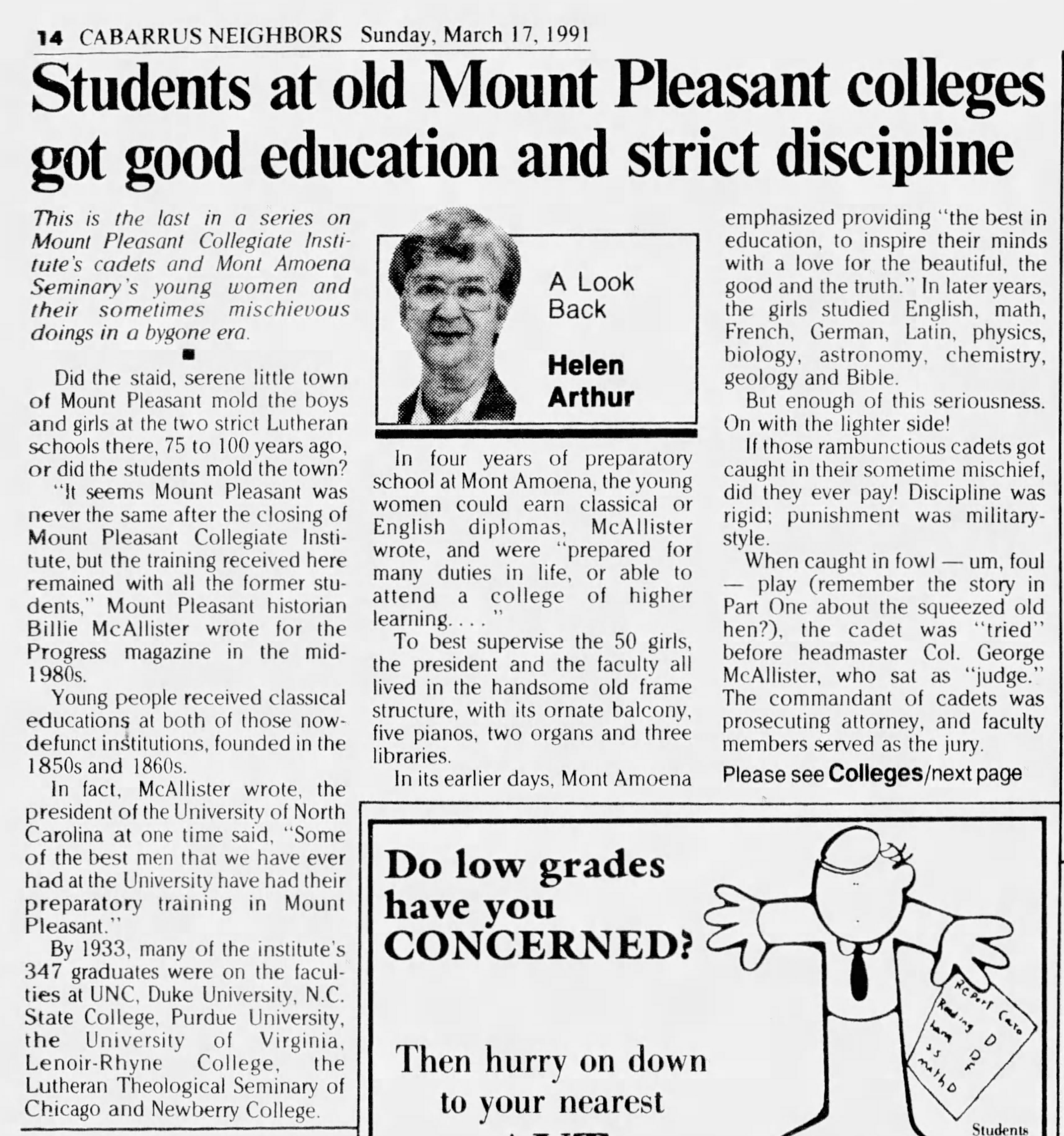 Cabarrus County historian and journalist Helen Arthur-Cornett wrote this article for her column “A Look Back,” for the Charlotte Observer‘s (Charlotte, NC) Cabarrus Neighbors section dated 17 Mar 1991.