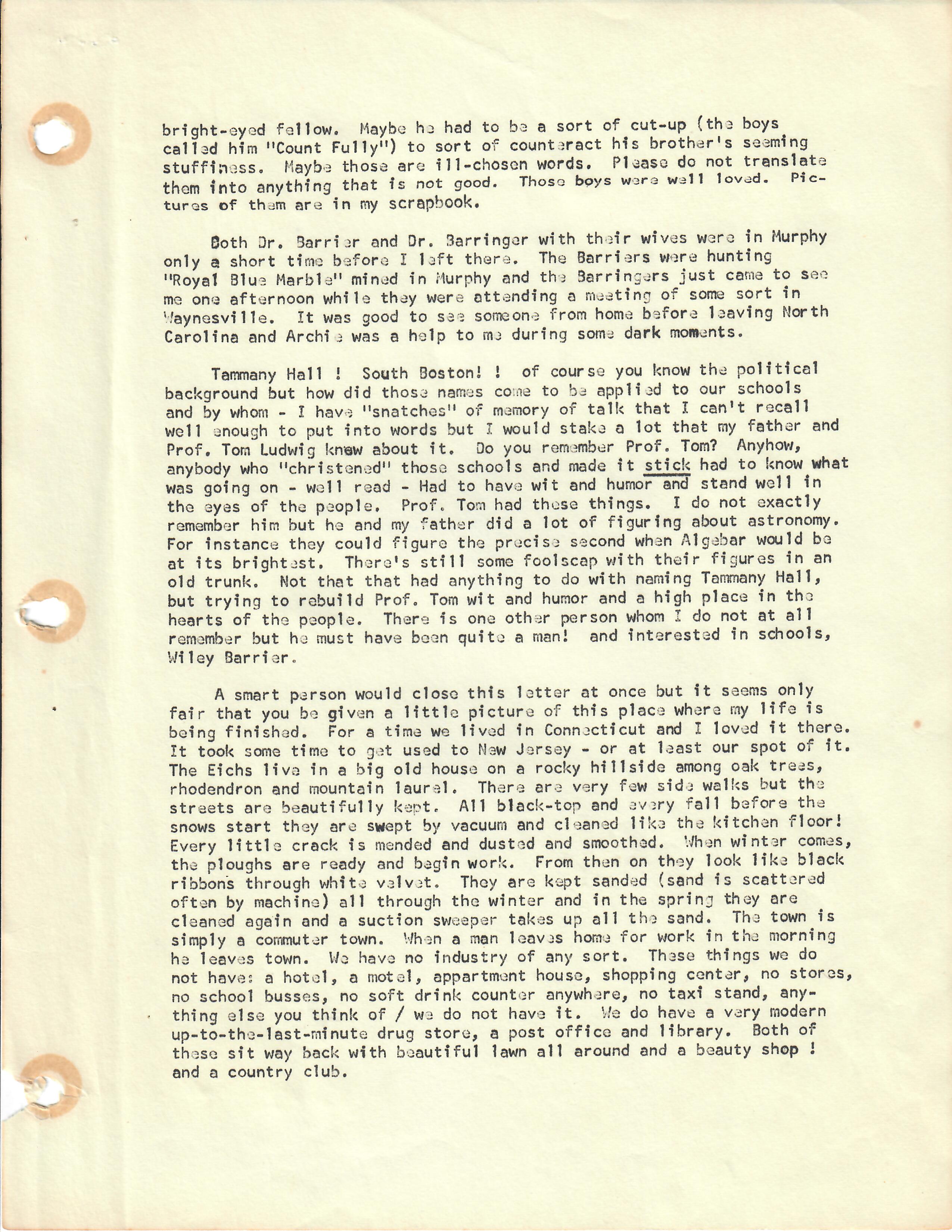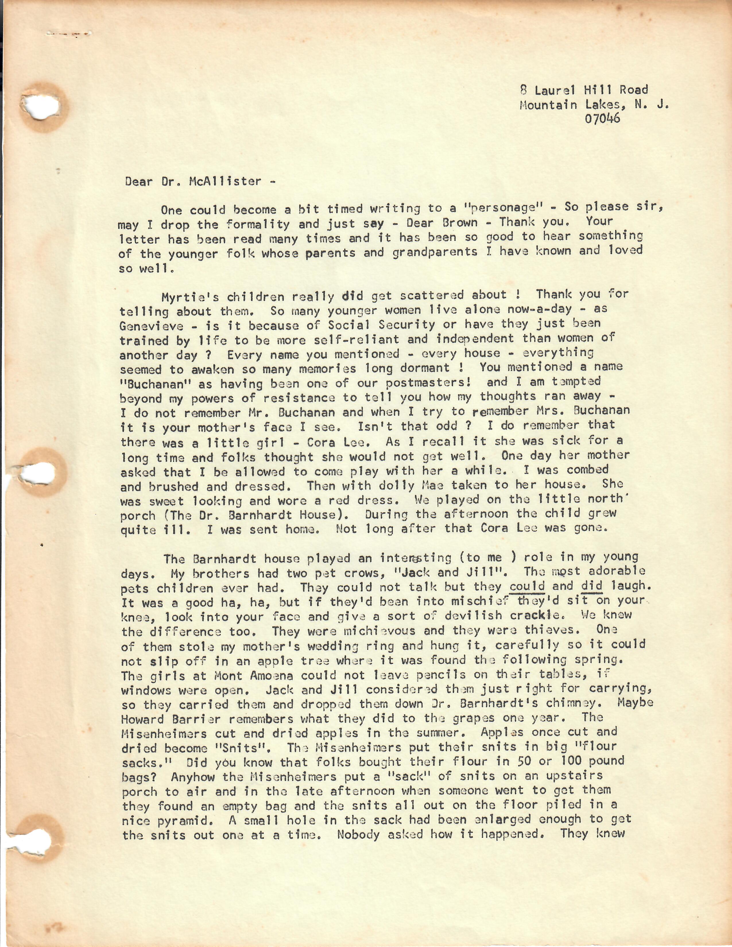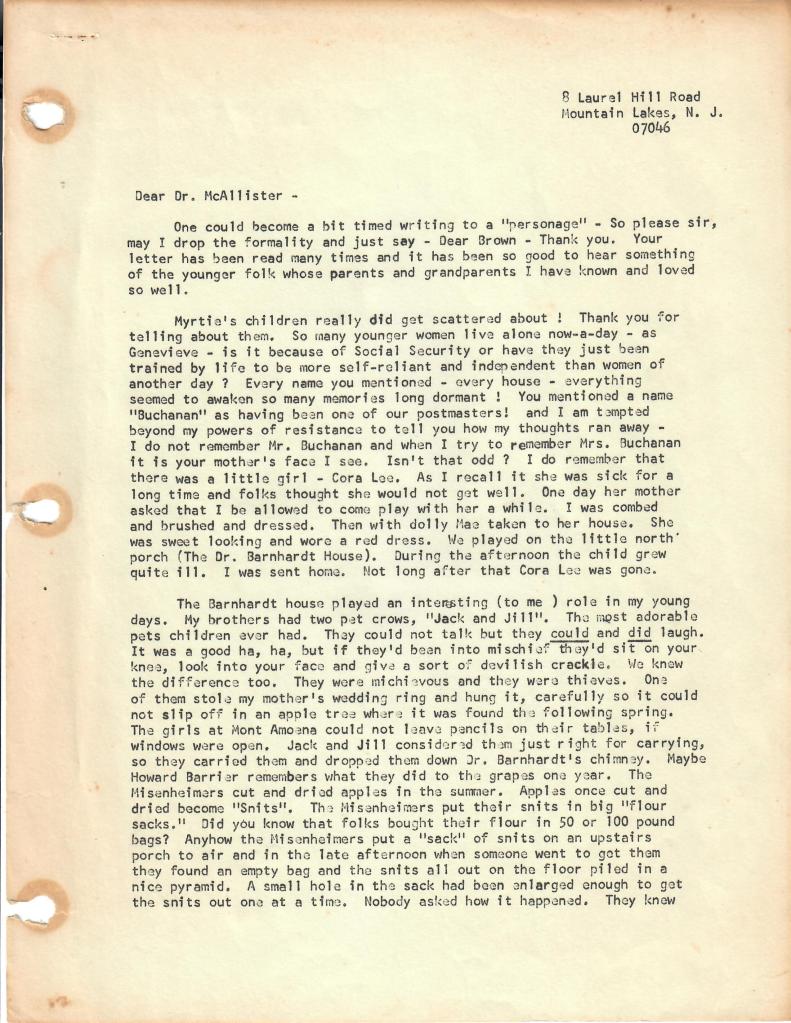Undated letter written by Anna Belle Barrier Axley to educator R. Brown McAllister, c. 1960. Possibly in response to visiting Mount Pleasant for the Mont Amoena historical marker installation celebration on October 1, 1962.