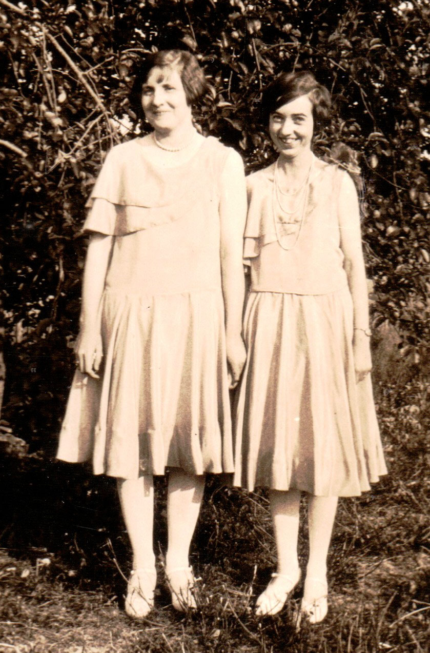 Mary Ella Barrier and Verna Mae Hahn on graduation day, 22 May 1927. They are wearing light green silk dresses.