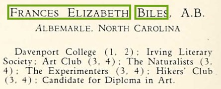 Biles, Elizabeth, 1927 Greensboro College-2 Published December 23, 2022 at 445 × 180 in Biles, Frances “Elizabeth” ← Previous Next → Elizabeth Biles, Greensboro College (Greensboro, NC), 1927..