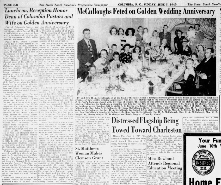 In celebration of their 50th wedding anniversary, Dr. and Mrs. H. A. McCullough, with their seven children and their families, are having a family dinner at 1 p.m. Monday, May 30, at the Jefferson hotel. The children are: The Rev. Paul G. McCullough of White Rock; Mrs. W. B. Gouger (Miriam McCullough) of Southern Pines, N. C.; Mrs. W. L. Haltiwanger (Hazel McCullough) of Hamlet, N. C.: the Rev. Henry A. McCullough, Jr., of Lincolnton, N. C.; Mrs. A. T. Brown, Jr., (Sarah McCullough) of Columbia; Mrs. J. B. Baker (Margaret McCullough) of Sumter and the Rev. John B. McCullough of Aiken.