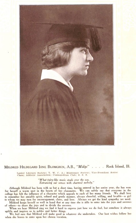 Gastonia, NC … Mrs. Mildred Blomgren Blackwelder, age 85, died Tuesday, March 12, 1985, at the NC Lutheran Home, Salisbury, NC, where she had been a resident for three years. A native of Lowell, MA, she was born July 17, 1899 to the late Rev. Dr. Carl A. Blomgren and Sigrid Soderberg Blomgren. She attended the Academy of Augusta College – Augusta College, Rock Island, IL, and graduated with an A.B. Degree from Elizabeth College, Salem, VA, Class of 1921. She taught in the Public schools of SC, SD, and Mt. Pleasant, NC. She married the Rev. Dr. Leroy Emerson Blackwelder in 1927 and was active at the Lutheran Churches, at Faith, Mooresville, NC, and the Lowman Home, White Rock, SC. She moved with her husband to Gastonia, NC upon his retirement in 1961, where she was active with her husband in the Holy Trinity Lutheran Church in Gastonia, NC. Active in the NC Synod of the Lutheran Church Women, she had served as President and member of the Executive Board. Mrs. Blackwelder is survived by a daughter, Mrs. Phylis B. Perry of Gastonia, NC; a granddaughter, Mrs. Milda P. Minter; a great-granddaughter, Shannon Minter, both of Agua Dulce, CA; a sister, Mrs. Svanhild B. Peterson of Joplin, MO; and nieces and nephews of st. Paul, MN. Graveside services will be conducted at 4 PM Thursday, March 14, 1985, in the Mt. Hermon Lutheran Church Cemetery Concord, NC by the Rev. C. Peter Setzer. Memorials may be made to the NC Lutheran Home, 820 Klumac Road, Salisbury, NC 28144. Funeral under the direction of McLean & Son, Gastonia, NC.