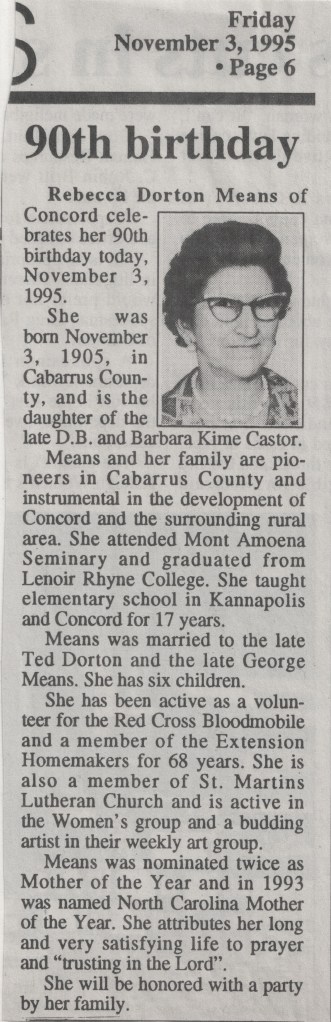Mrs. Means has five children: the Rev. Richard B. Dorton, pastor of St. Enoch’s Lutheran church, Enochville; the Rev. L. Franklin Dorton, pastor of Christiana Lutheran church, Granite quarry; Mrs. Donald D. Coley, Winston-Salem school teacher; Ronald Dorton of New York, who plans to attend college when his present term of military service is completed; and Zuebecca Frances Dorton, freshman at Lenoir Rhyne college, Hickory.