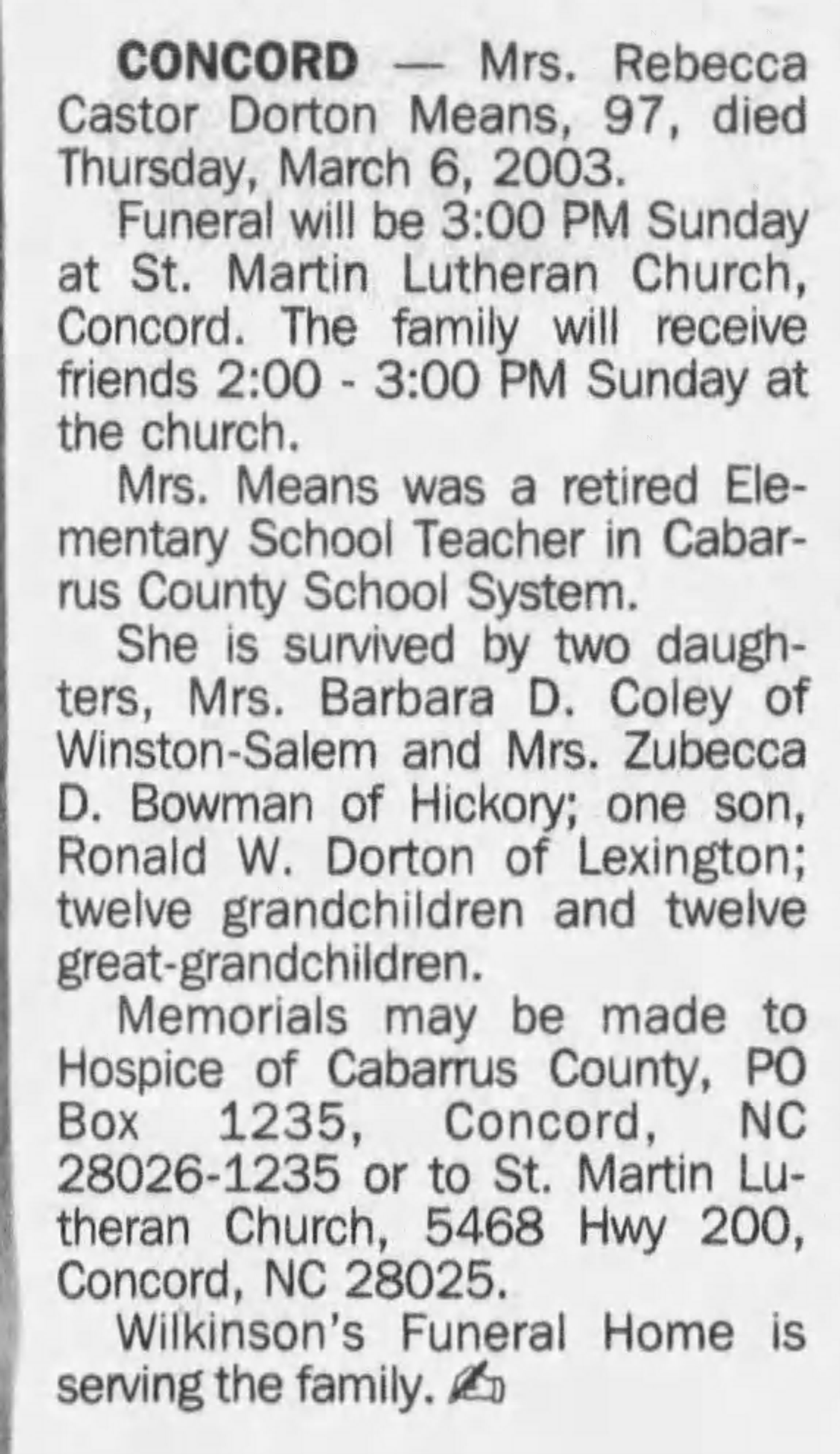 Rebecca was a member of the Castor Family who lived on Center Grove Road, Kannapolis, NC. She married Ted R. Dorton, deceased in 1948. She lived at her home on Center Grove Road with her 5 children until a second marriage to George Means then moved to South Union Street, Concord, NC, until her death. She was a homemaker, a mill worker, a school teacher and a busy church member at Center Grove Lutheran, Kannapolis, NC, St. James Lutheran, Concord, NC and St Martin’s Lutheran, Hwy 200, Concord, NC.