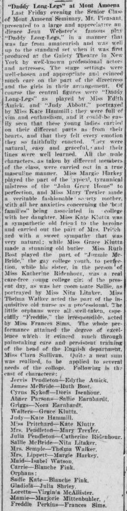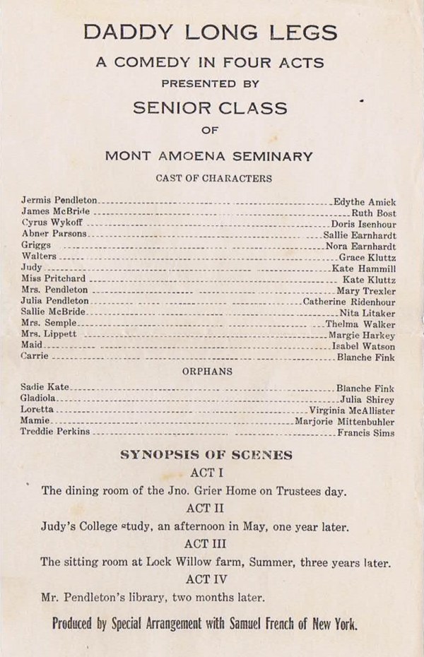 Based on the book by Jean Webster. Set in turn-of-the-century New England, the musical tells the story of orphan Jerusha Abbott of the John Grier Home and her mysterious benefactor who agrees to send her to college, who she dubs “Daddy Long Legs” after seeing his elongated shadow. Under the conditions of her benefactor, Jerusha sends him a letter once a month, describing her new-found experiences with life outside the orphanage.