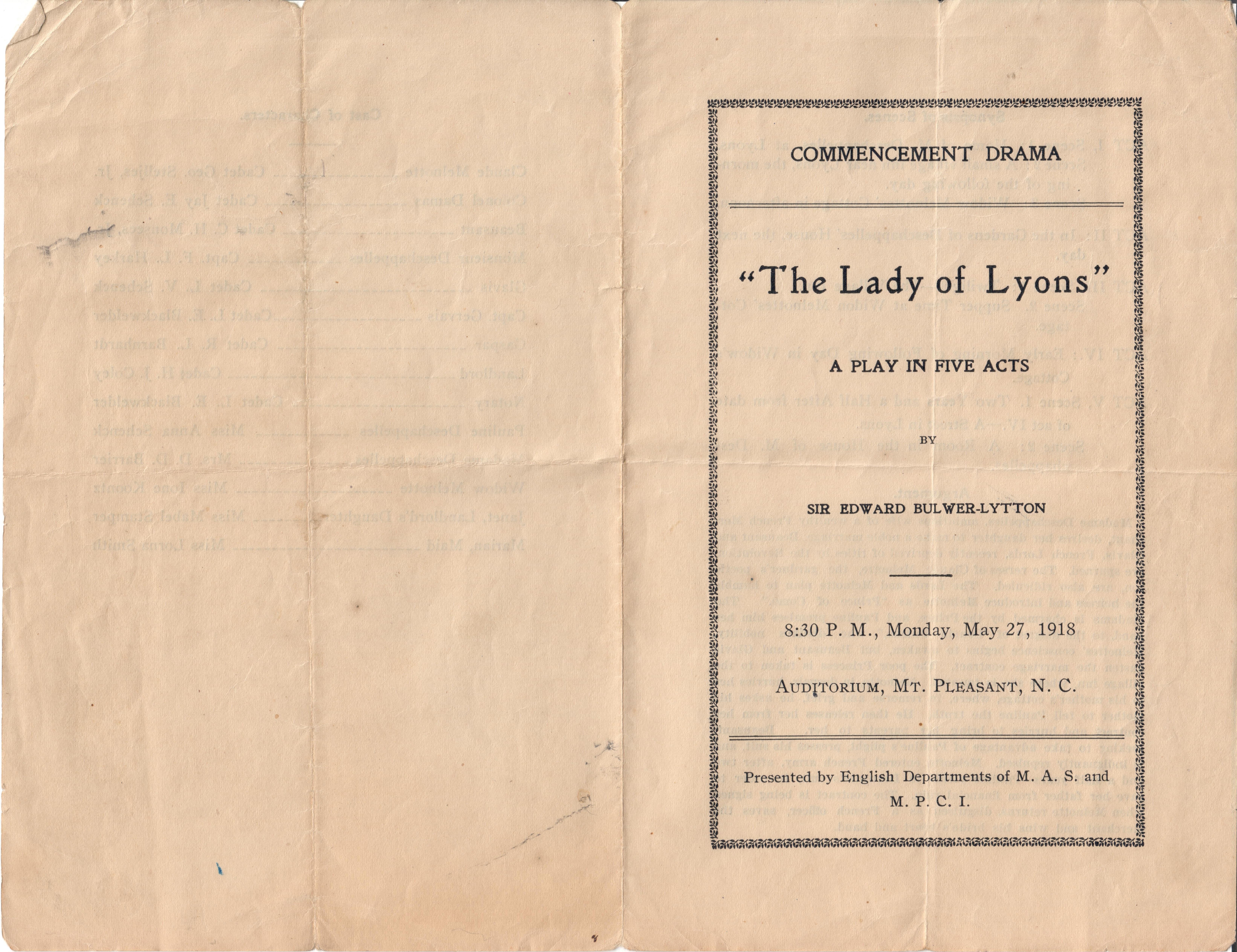 Class Play: “The Lady of Lyons,” 27 May 1918 From the Julia Ethelyn Crabtree McAllister Collection. Share this: Click to email a link to a friend (Opens in new window) Email Click to print (Opens in new window) Print