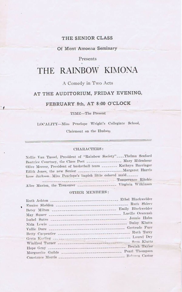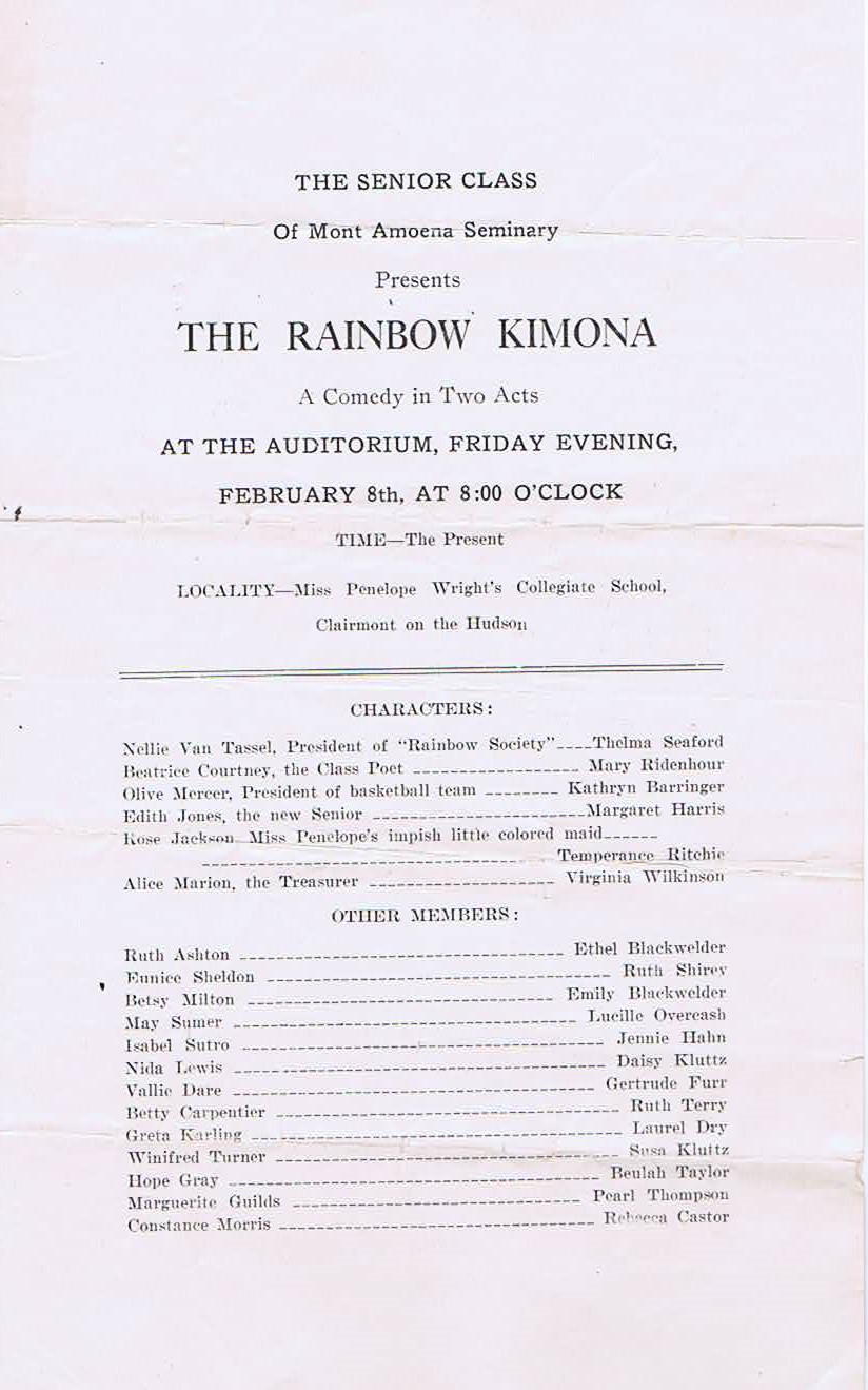 The story of The Rainbow Kimona is a club composed of seven of the Senior Class of Miss Penelope Wright’s Collegiate School, each member wearing a Kimona representing one of the seven colors of the Rainbow. In a small apartment an entertainment is arranged in which each girl assumes a leading character in one of Shakespeare’s plays, burlesqued in outrageously comical style.