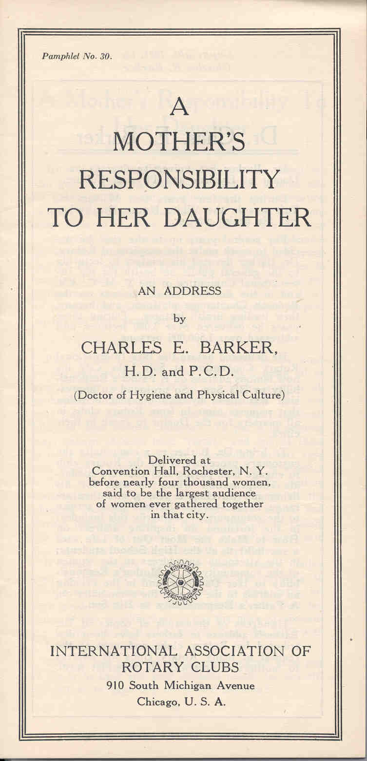 Dr. Barker spoke in Concord under the auspices of the Concord Rotary Club. He spoke to the students of the High School at 9 o’clock, to a body of women at Central School at 3:30 o’clock, and to a large audience of men in the court house at 8 p. m. His subject at the evening meeting was “A Father’s Duty to His Son,” and though these talks were not limited to sex topics by any means, hey formed the bulk of the speaker’s addresses, and he minced no words in driving home his points.