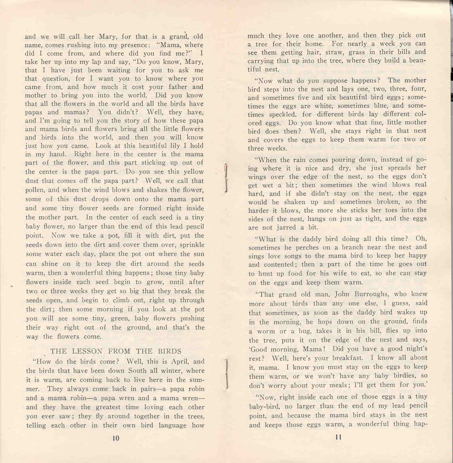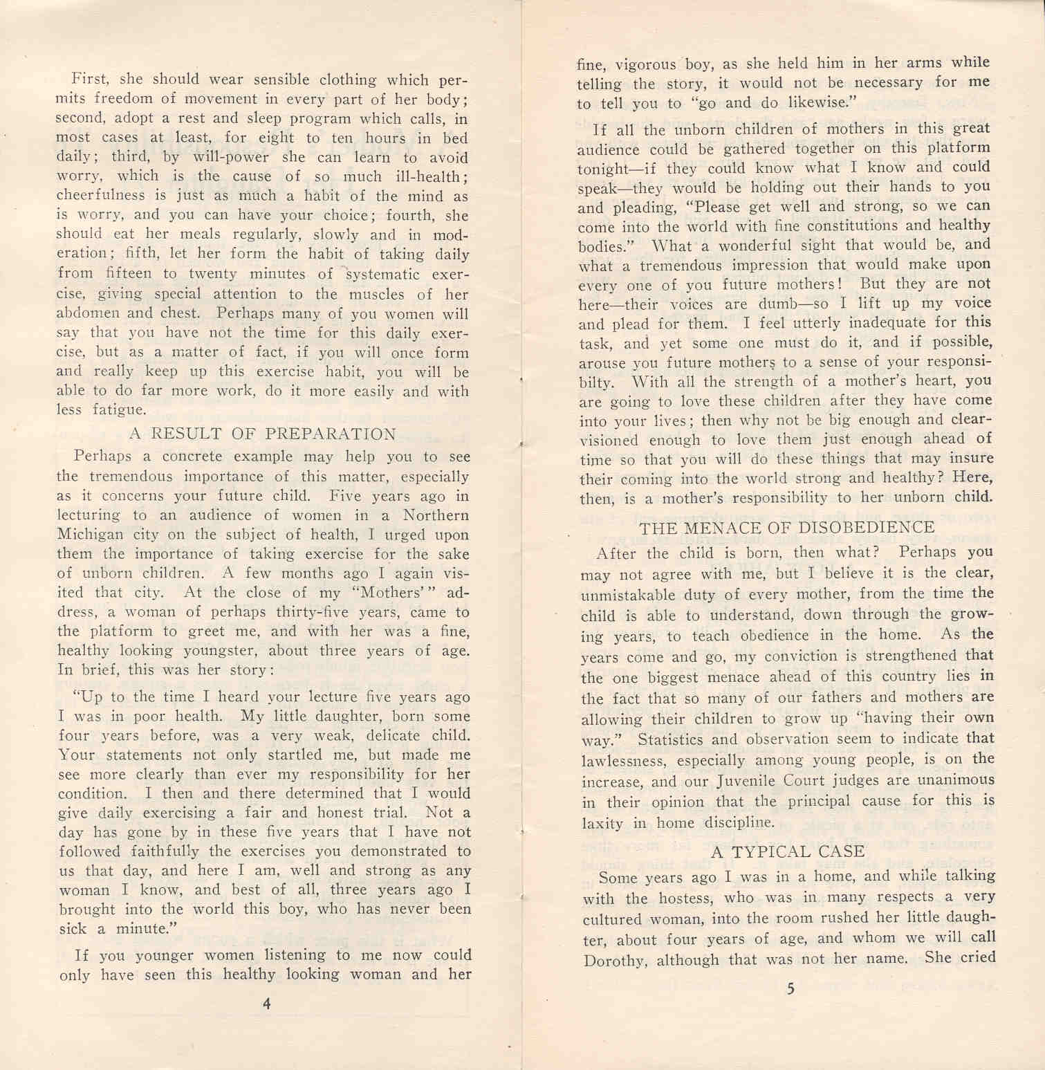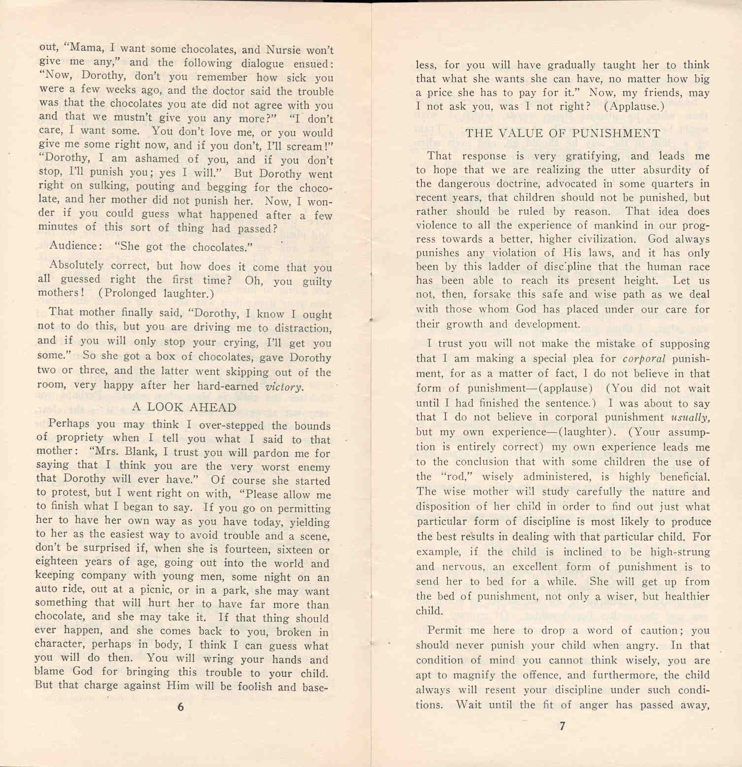 Outlining the most important responsibilities of a mother, Dr. Barker declared that obedience of the child in the home comes first. As an example of this Dr. Barker related the first years of Helen Keller’s life, whom, he said, he regarded as the most wonderful personality from certain standpoints , in the world. Helen Keller never would have been the remarkable person she is, if she had not been taught to obey, even with her handicaps. A child should never be unpunished, and it is the mother’s duty to study the child and bear upon the child the discipline which will give the best results.
