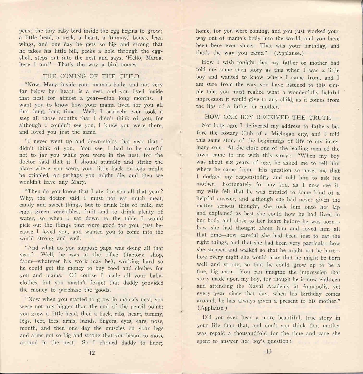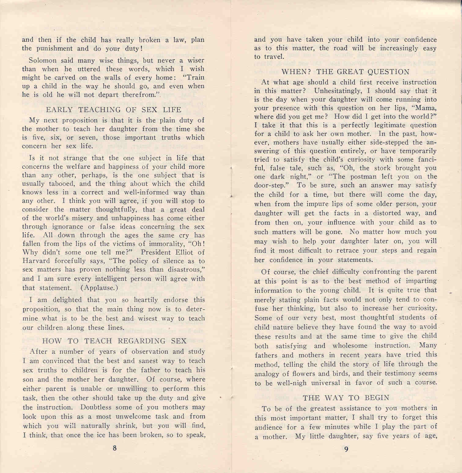 Decrying the ignorance of sex matters in this country as “criminal,” Dr. Barker declared that it is the duty of every father to explain the matter to his son as soon as the boy is able to understand. He advocated the use of analogies of flowers and birds in explaining reproduction to children. However, he made it clear that it is far better for the father to tell his son the whole truth on the subject rather than have him learn it from some vile-[unreadable].