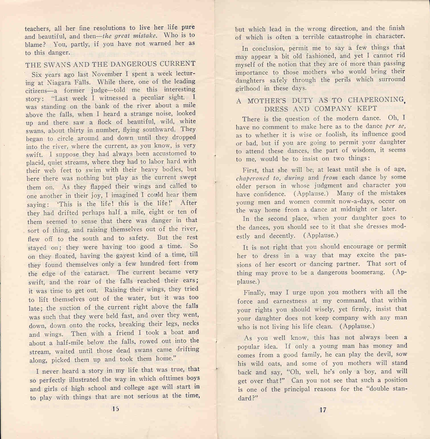 Dr. Barker gained the trust of his audience with lively humor and a promise to not be “preachy,” but his message was straight forward, “Vice is a monster dancing his way into every part of the United States and it is up to the older people to correct the social and moral standards of civilization which have been hanging in the balance since the world war [WWI].” Of particular concern for young women were: automobile rides at night, dancing to modern jazz, impure motion pictures, and immodest clothing.