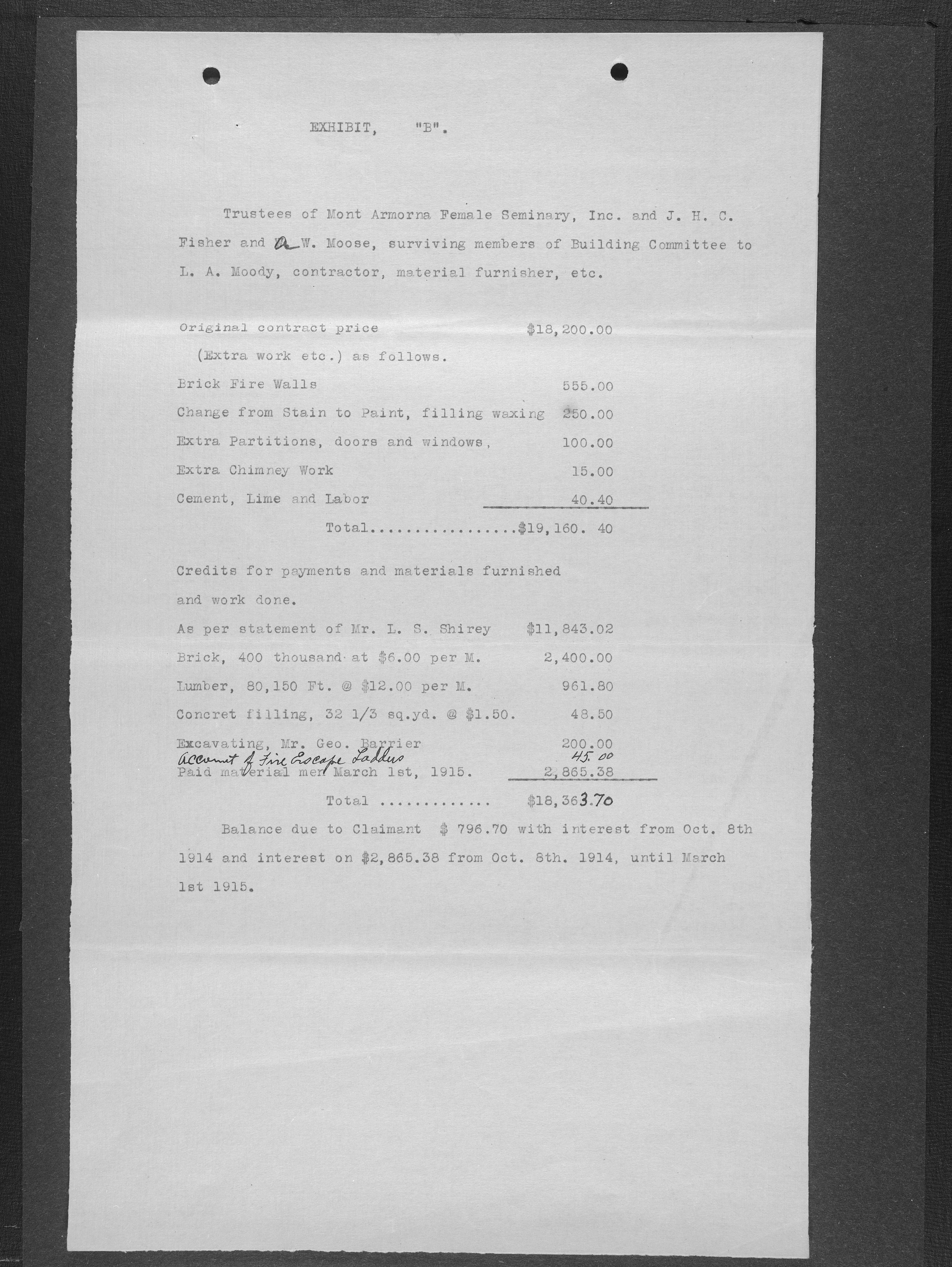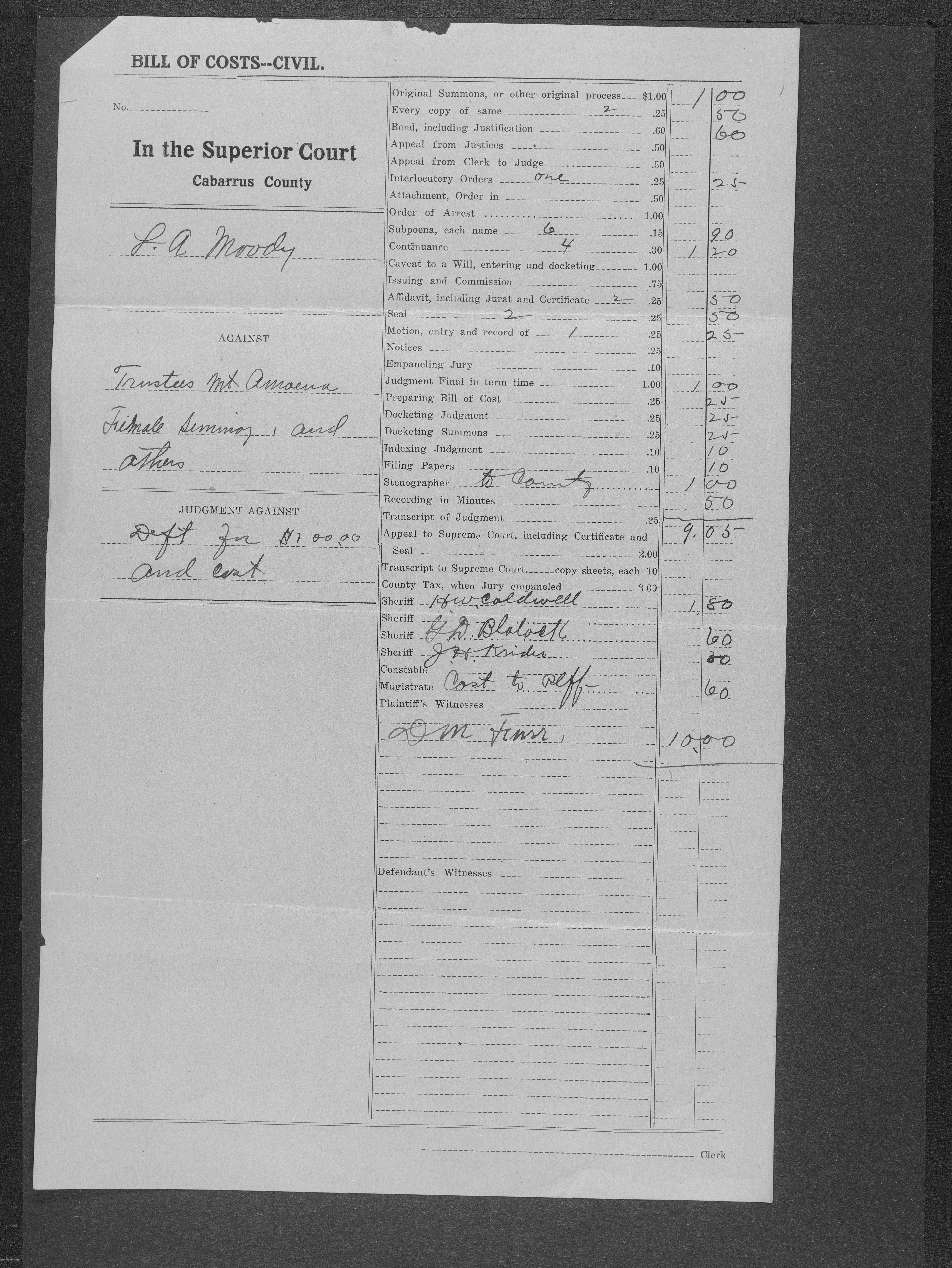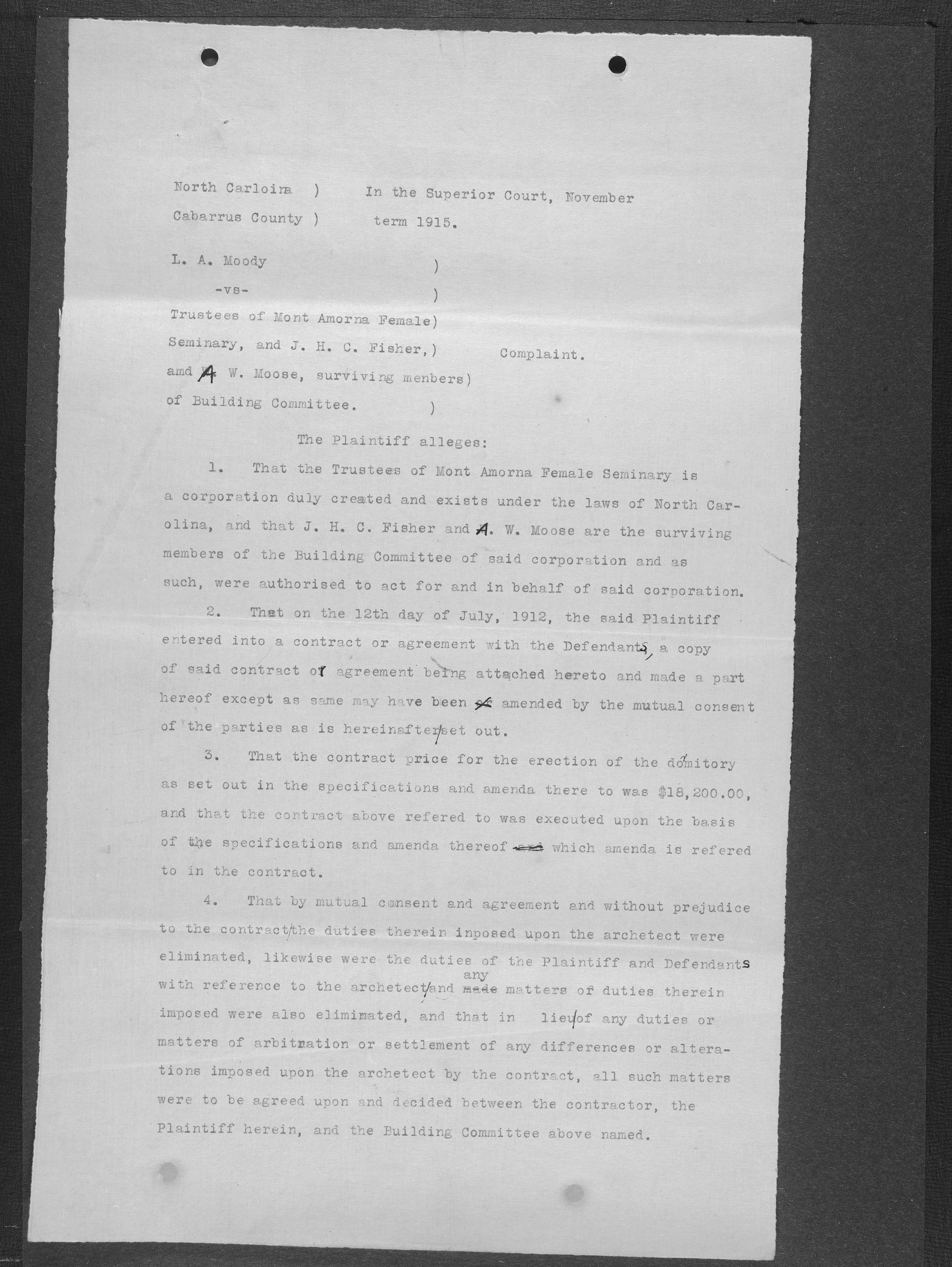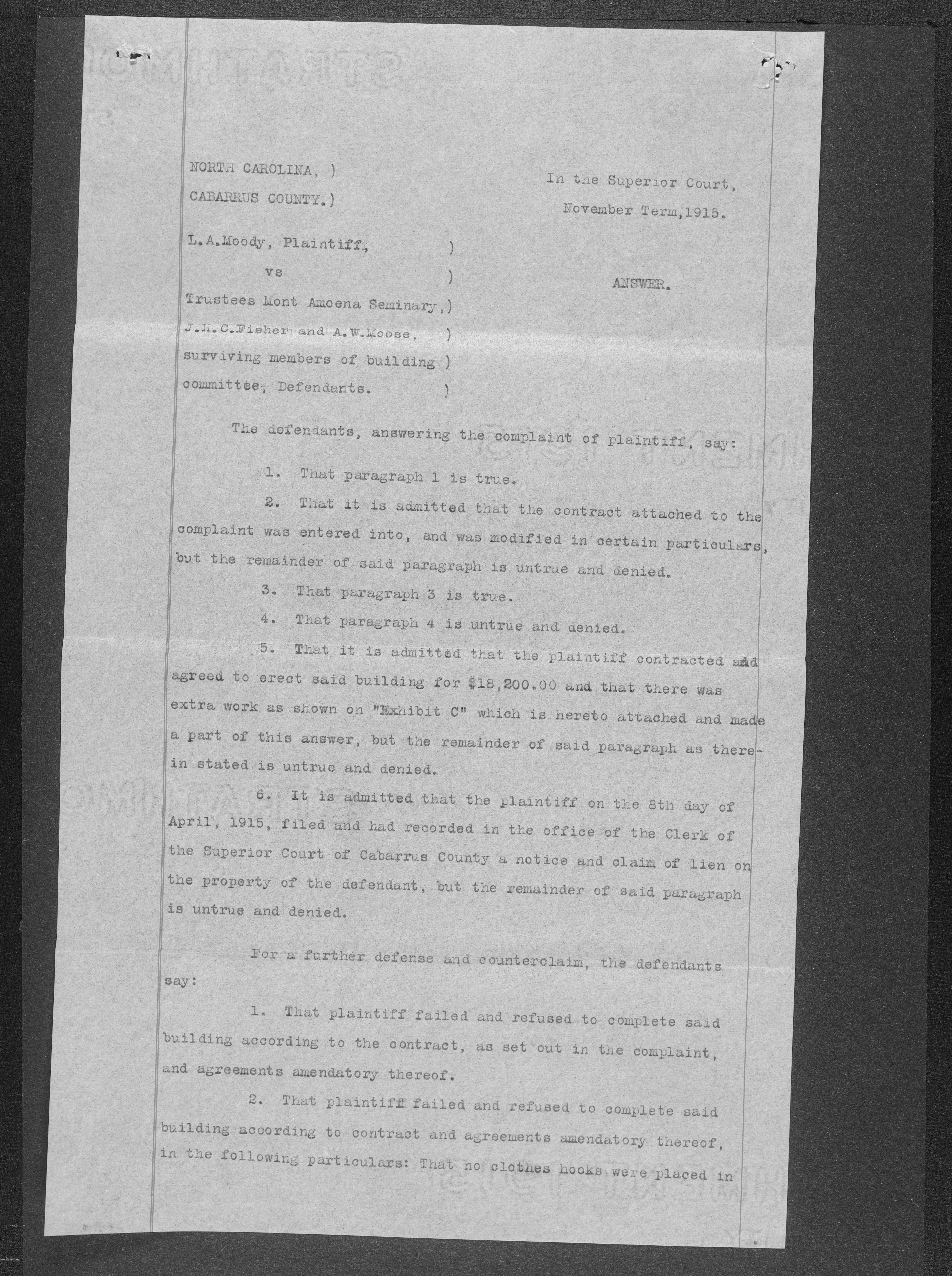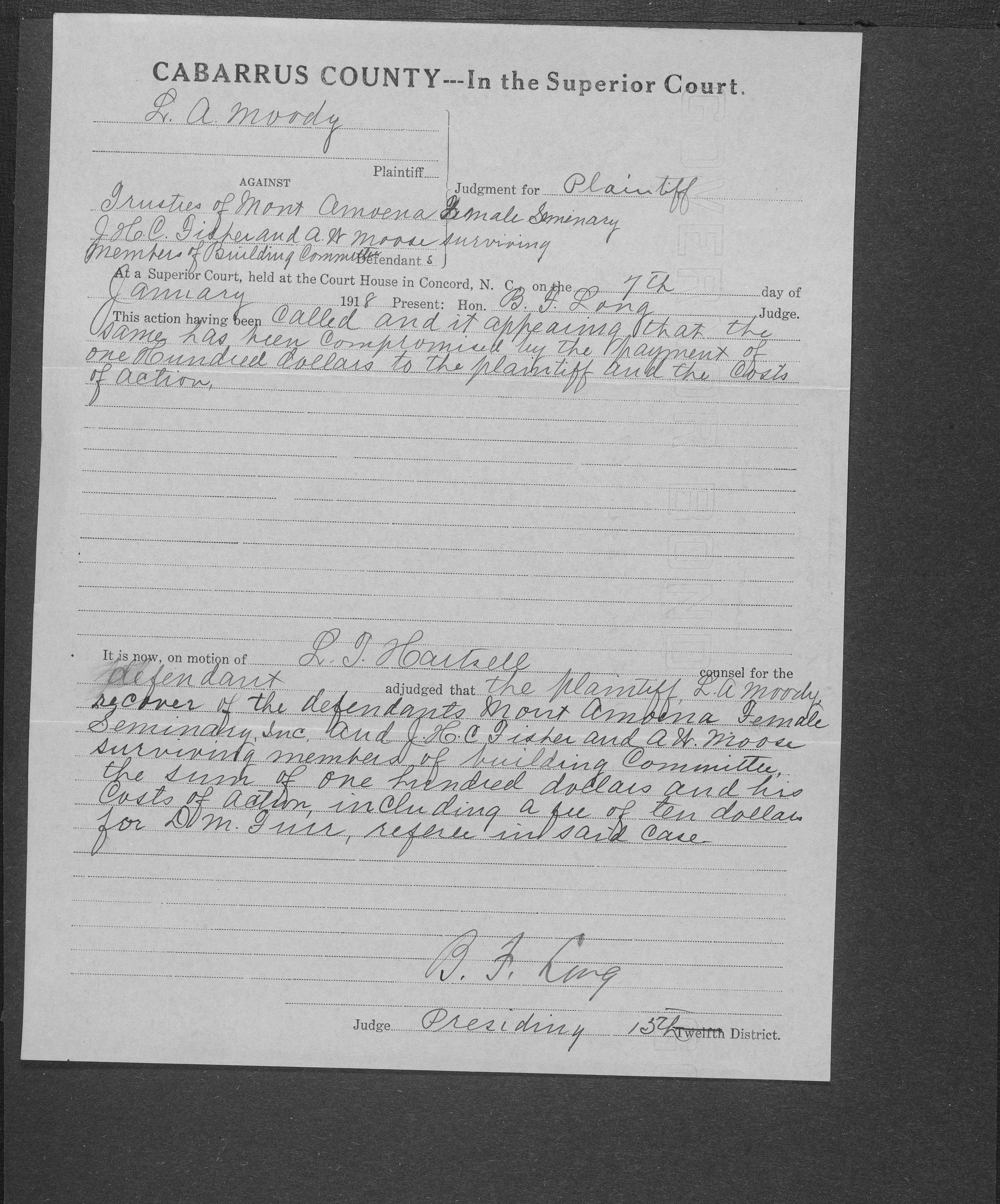 When the Mont Amoena Seminary building burned on Thanksgiving Day in 1911, the Mont Amoena Board of Directors awarded the contract for the construction of a new brick seminary building to L. A. Moody at their May 1912 meeting. The school reopened in the fall of 1913, but Moody and the Mont Amoena Building Committee disagreed over compensation and on work that was not yet completed. Moody filed a civil action against the Trustees, and building committee members, Rev. Prof. J. H. C. Fisher and A.W. Moose. Moody claimed an additional $796.70 plus interest. The case was resolved by compromise, with the defendants agreeing to pay L. A. Moody $100 plus legal costs. The proceedings took place at the courthouse in Concord, N.C., on January 7th, 1917 with Judge B. F. King presiding and D. M. Furr acting as referee.