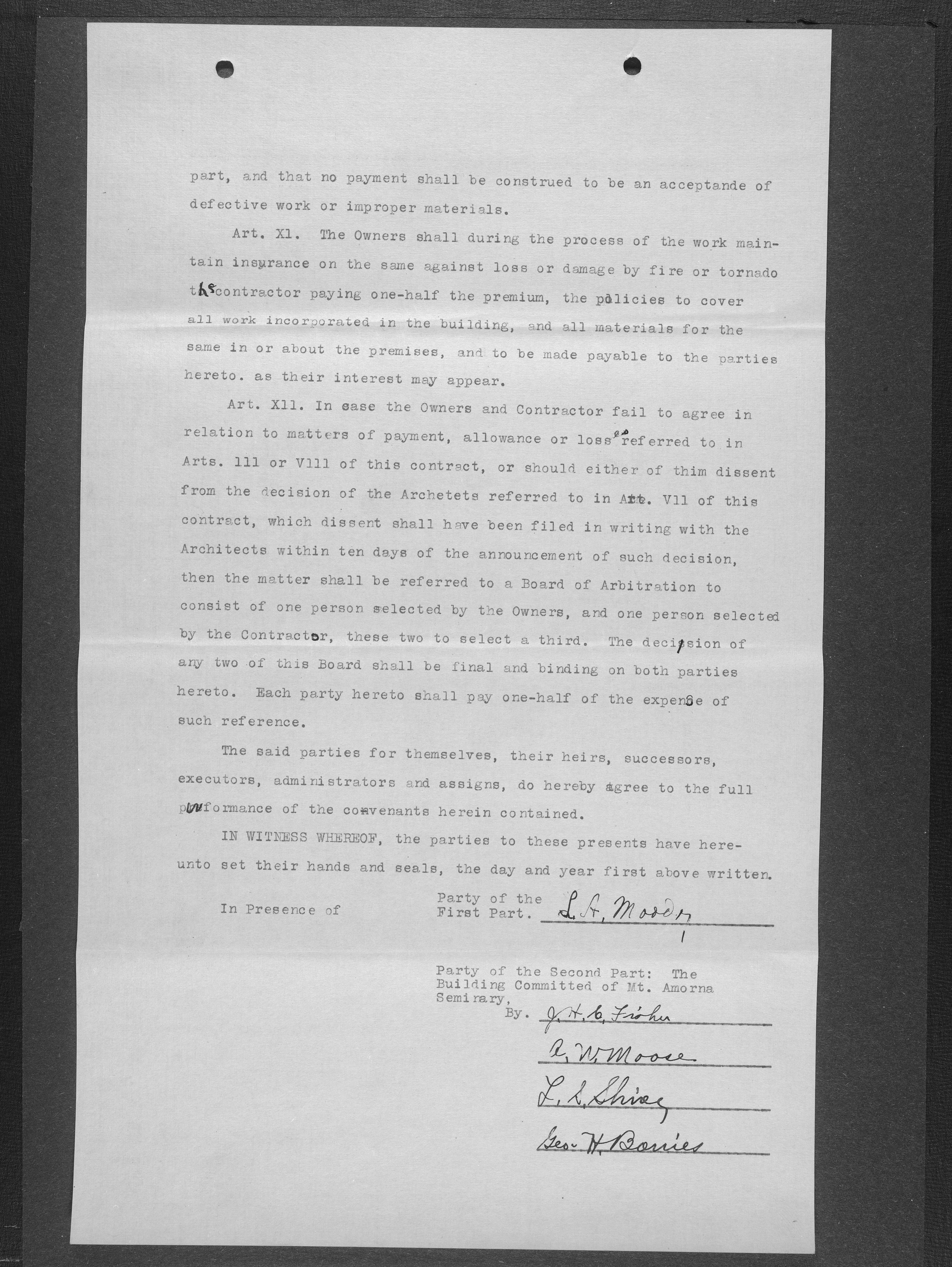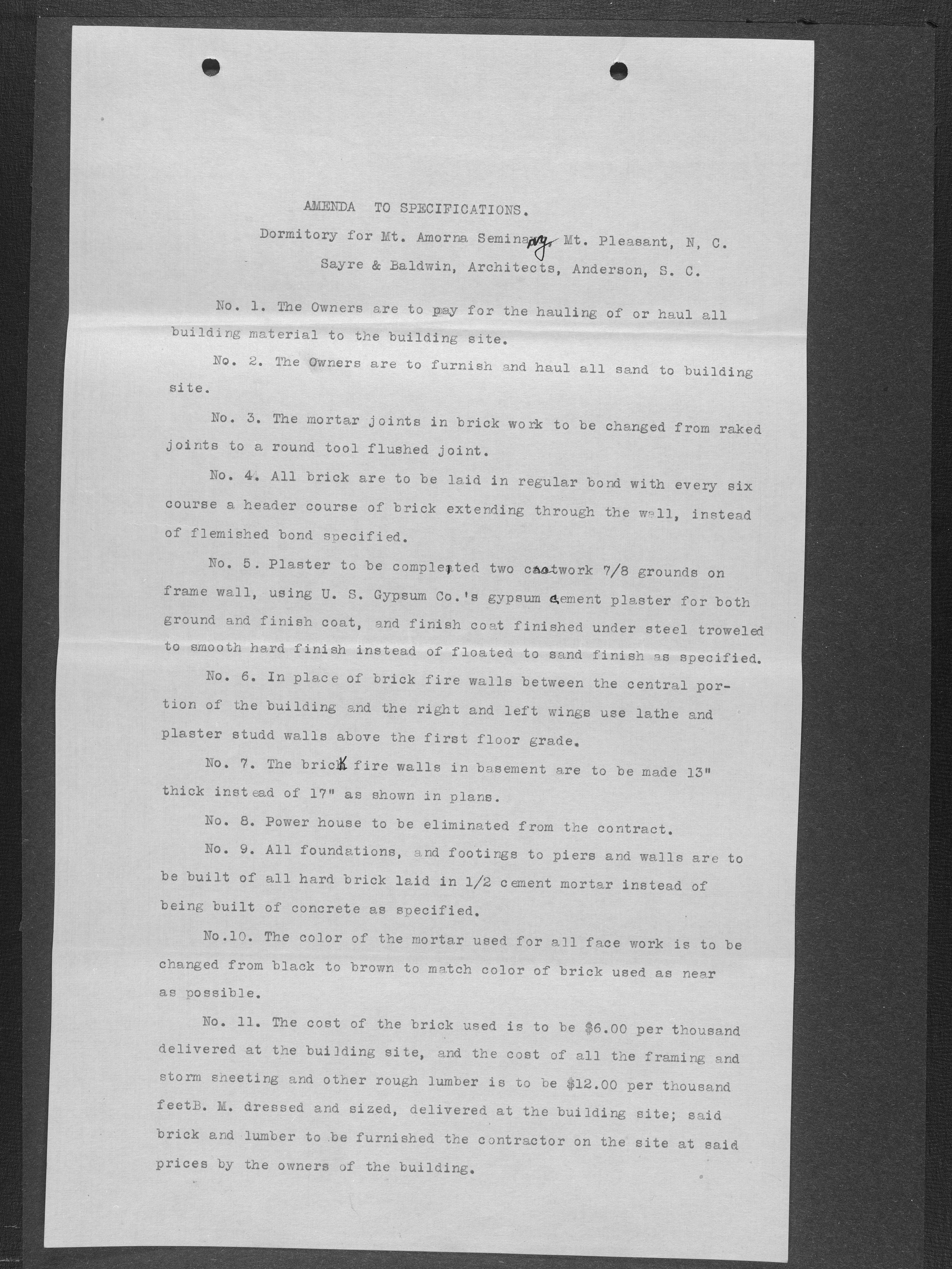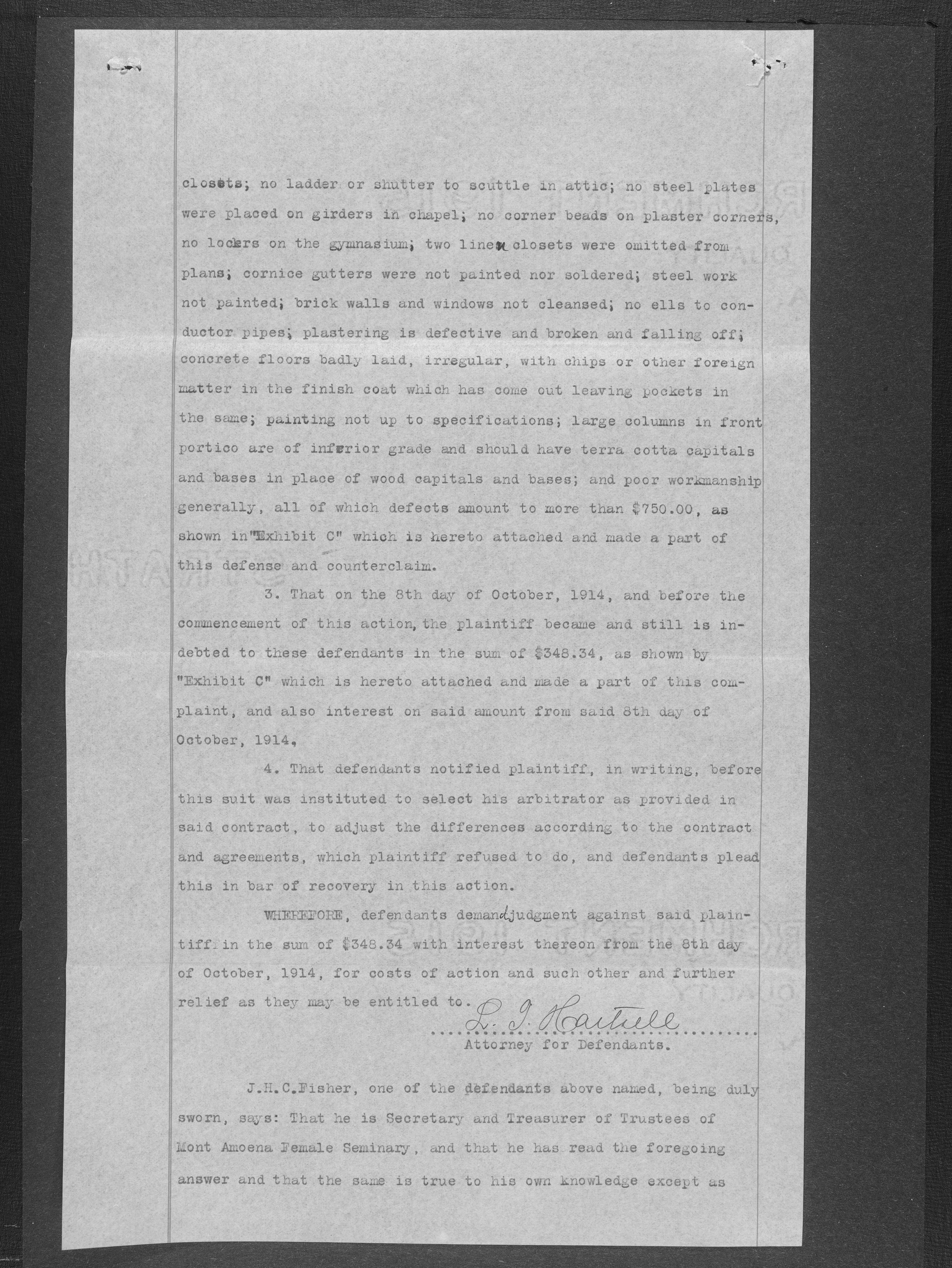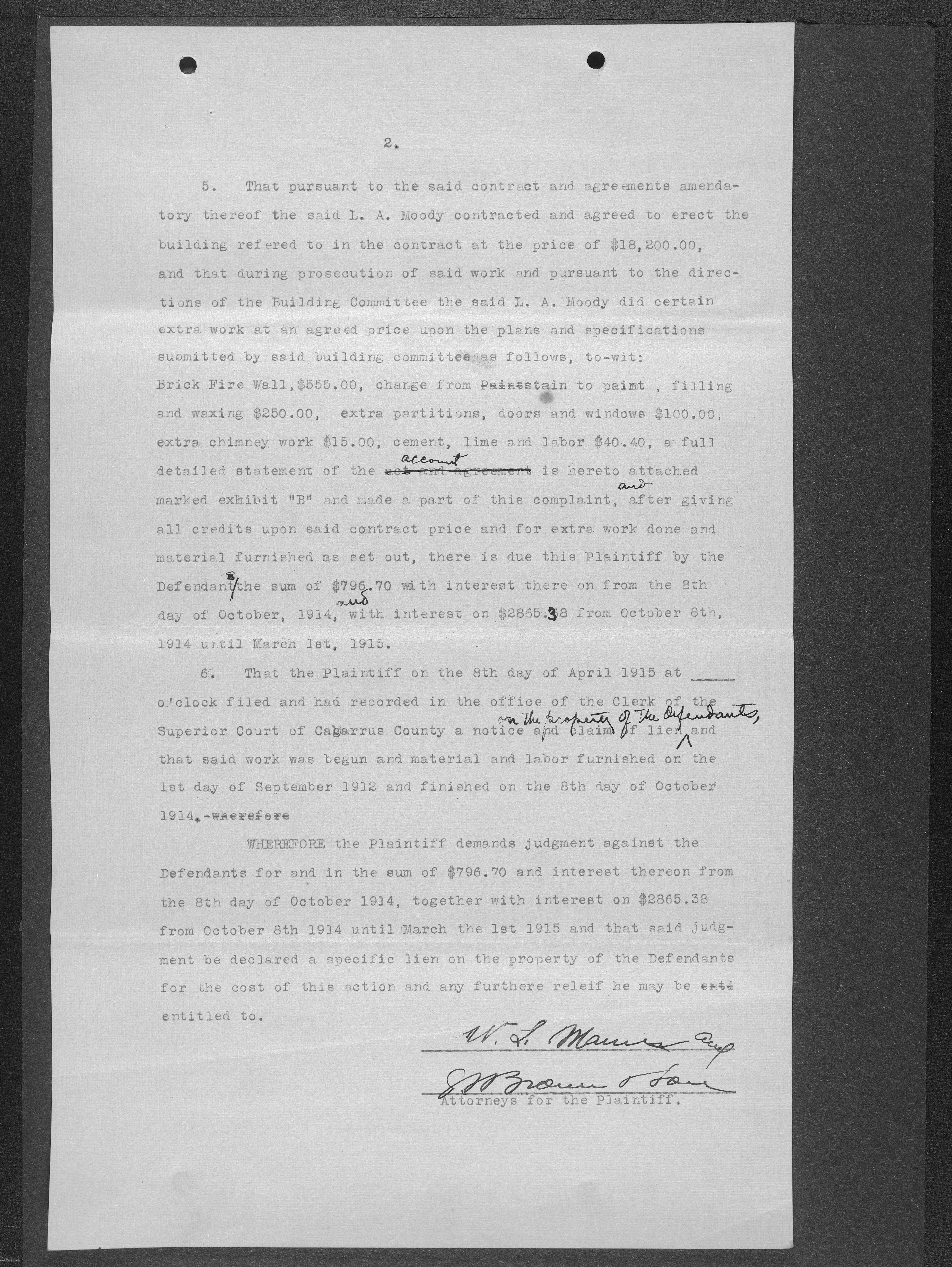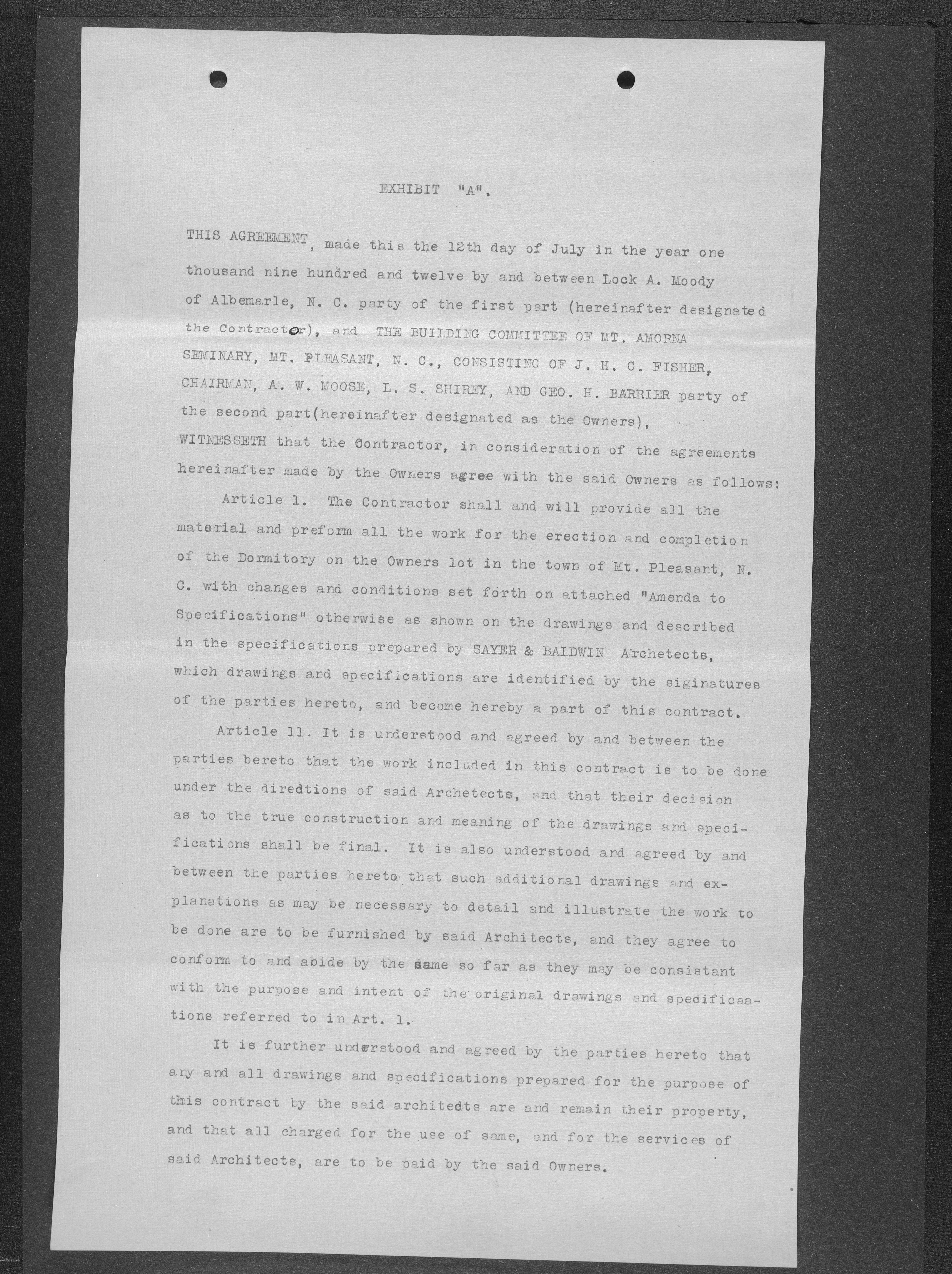 When the Mont Amoena Seminary building burned on Thanksgiving Day in 1911, the Mont Amoena Board of Directors awarded the contract for the construction of a new brick seminary building to L. A. Moody at their May 1912 meeting. The school reopened in the fall of 1913, but Moody and the Mont Amoena Building Committee disagreed over compensation and on work that was not yet completed. Moody filed a civil action against the Trustees, and building committee members, Rev. Prof. J. H. C. Fisher and A.W. Moose. Moody claimed an additional $796.70 plus interest. The case was resolved by compromise, with the defendants agreeing to pay L. A. Moody $100 plus legal costs. The proceedings took place at the courthouse in Concord, N.C., on January 7th, 1917 with Judge B. F. King presiding and D. M. Furr acting as referee.