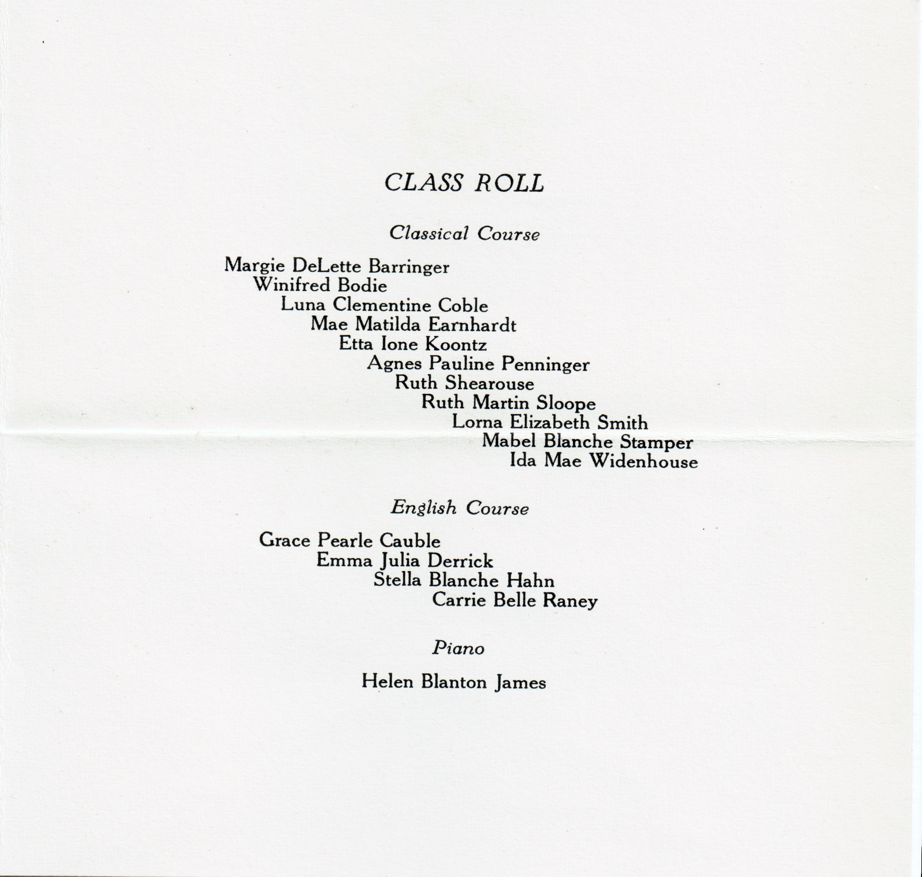 Classical Course – Margie Delette Barringer, Winifred Bodie, Luna Clementine Coble, Mae Matilda Earnhardt, Etta Ione Kootz, Agnes Pauline Penninger, Ruth Shearouse, Ruth Martin Sloope, Lorna Elizabeth Smith, Mabel Blanche Stamper, Ida Mae Widenhouse.