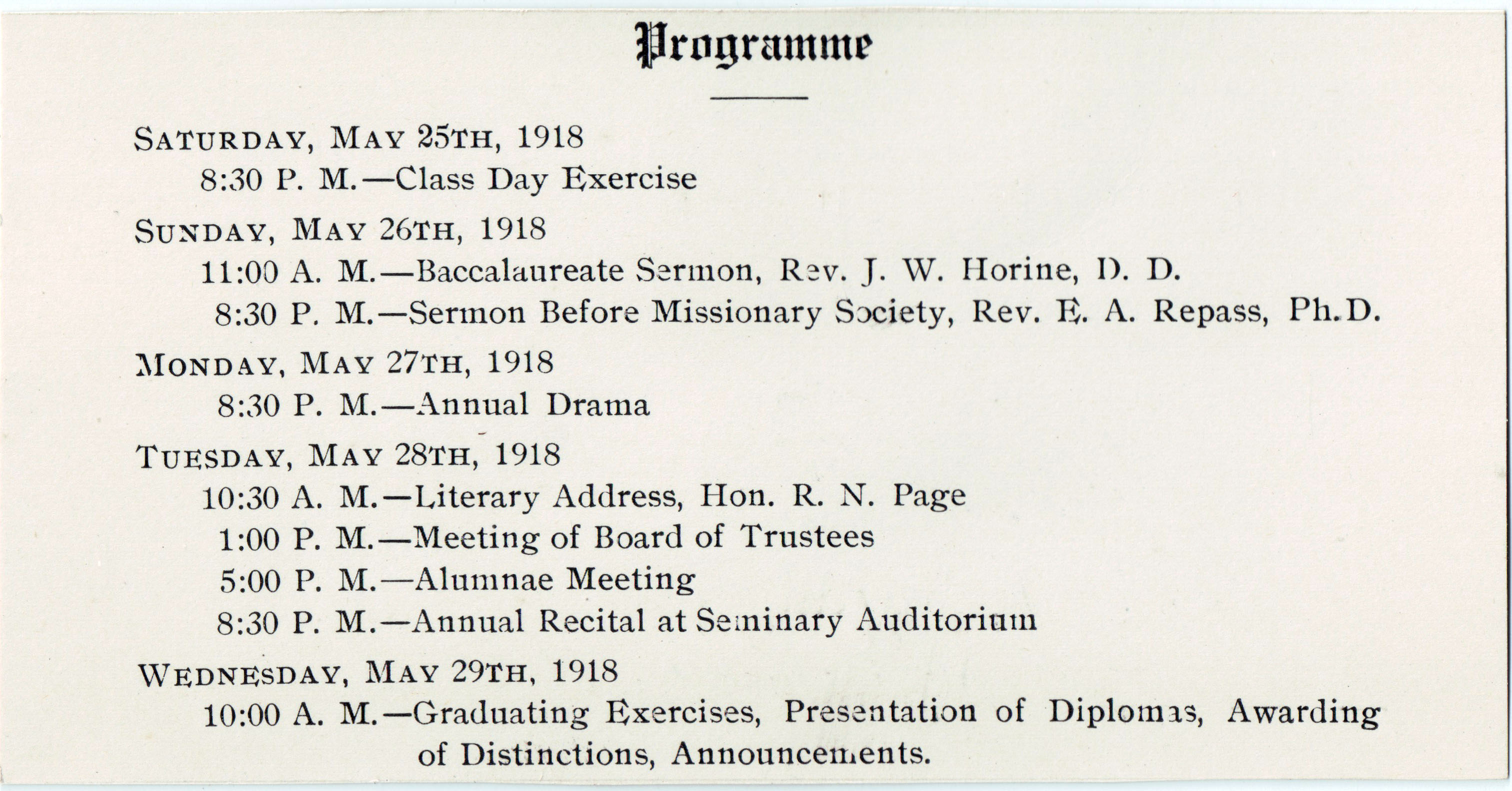 Sunday, May 26, 11 a.m. – Baccalaureate sermon, Rev. J. W. Horine, D.D.: 8:30 p.m., sermon before Missionary Society, Rev. E. A. Repass, Ph.D.