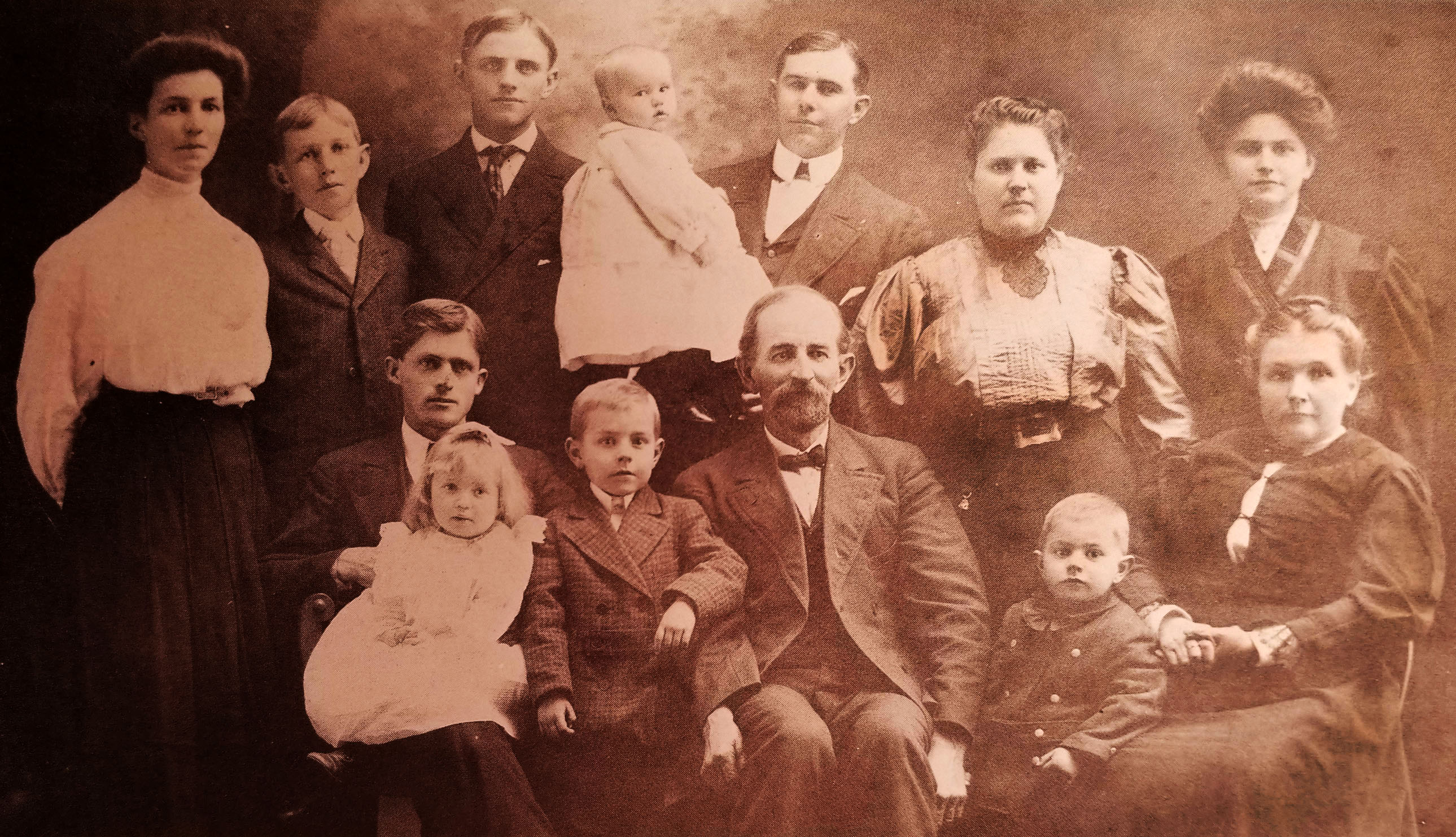 Luther H. Moose family, c. 1906. Front row: Frank Winders with daughter Margaret, Carl, Luther H. Moose, Floyd, Eva Frances Troutman Moose. Back: Annie Moose Winders, John D., Paul, Jacob O. holding Thomas Luther, Eltha Fisher Moose, and Elsie. From book Dutch Buffalo Creek Meeting House/Bethel United Church of Christ, 1974.