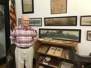 Hilbert Cobb “H. C.” Fisher, son of Dr. Hilbert A. Fisher and Ethel Mae Cobb Fisher, at the Eastern Cabarrus Historical Society Museum, July 2017. He is in front of a photo of his father’s Navy ship, USS Rhode Island, Courtesy of Barbara Fisher Gray.