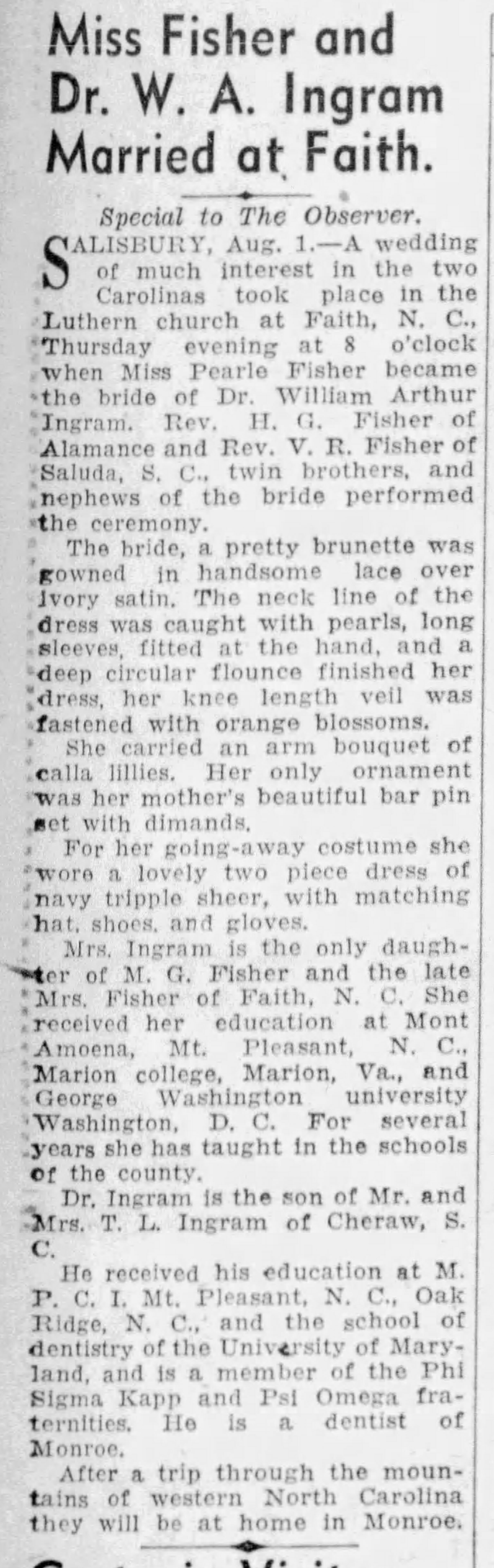 Mrs. Ingram is the former Pearle Anna Camilla fisher, only daughter of Mr. and Mrs. M. G. M. Fisher. She graduated from Mt. Amoena Seminary and Marion College. For several years she was a very successful in the public schools of North Carolina.