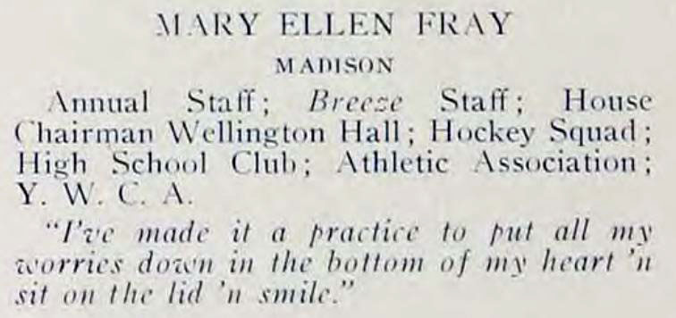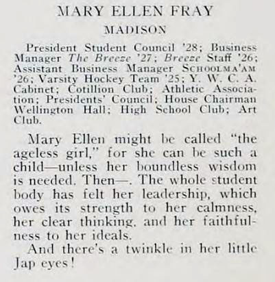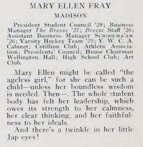 Mary Ellen Fray, Senior at State Teacher’s College (James Madison University), Harrisonburg, VA, 1928.