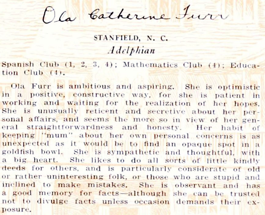 Mrs. Abernethy died at Eden Gardens in Concord, NC, on February 15, 2006. Ola was born to Walter C. Furr and Rena Little Furr in Cabarrus County, on November 25, 1906. She spent her childhood in Cabarrus County and her early education was through the public schools in Georgeville. She graduated from Mount Amoena Seminary in Mt. Pleasant and North Carolina College for Women (now UNC-Greensboro) in 1927. She majored in English and Mathematics and upon graduation began teaching seventh grade in the Mecklenburg County School System. During the next seven years, she taught in the public schools at Hickory Grove and Mint Hill. During World War II, she accepted employment at the US Post Office in Charlotte, and retired in 1956.