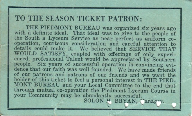 MA.DDOC.0048.02 Published February 9, 2026 at 2474 × 1498 in Hammill, Kate Ann ← Previous Kate Hammill Piedmont Lyceum Bureau season ticket, 1921-1922. Courtesy of Ben and Janet Callahan.