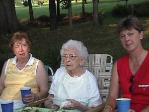 Margaret Ada Harris Quay (center) with daughter Bonnie Quay Howie (left) and granddaughter, Leslie Harris Quay (right) at a Harris family reunion, Aug 2003. Courtesy of Grier Harris.