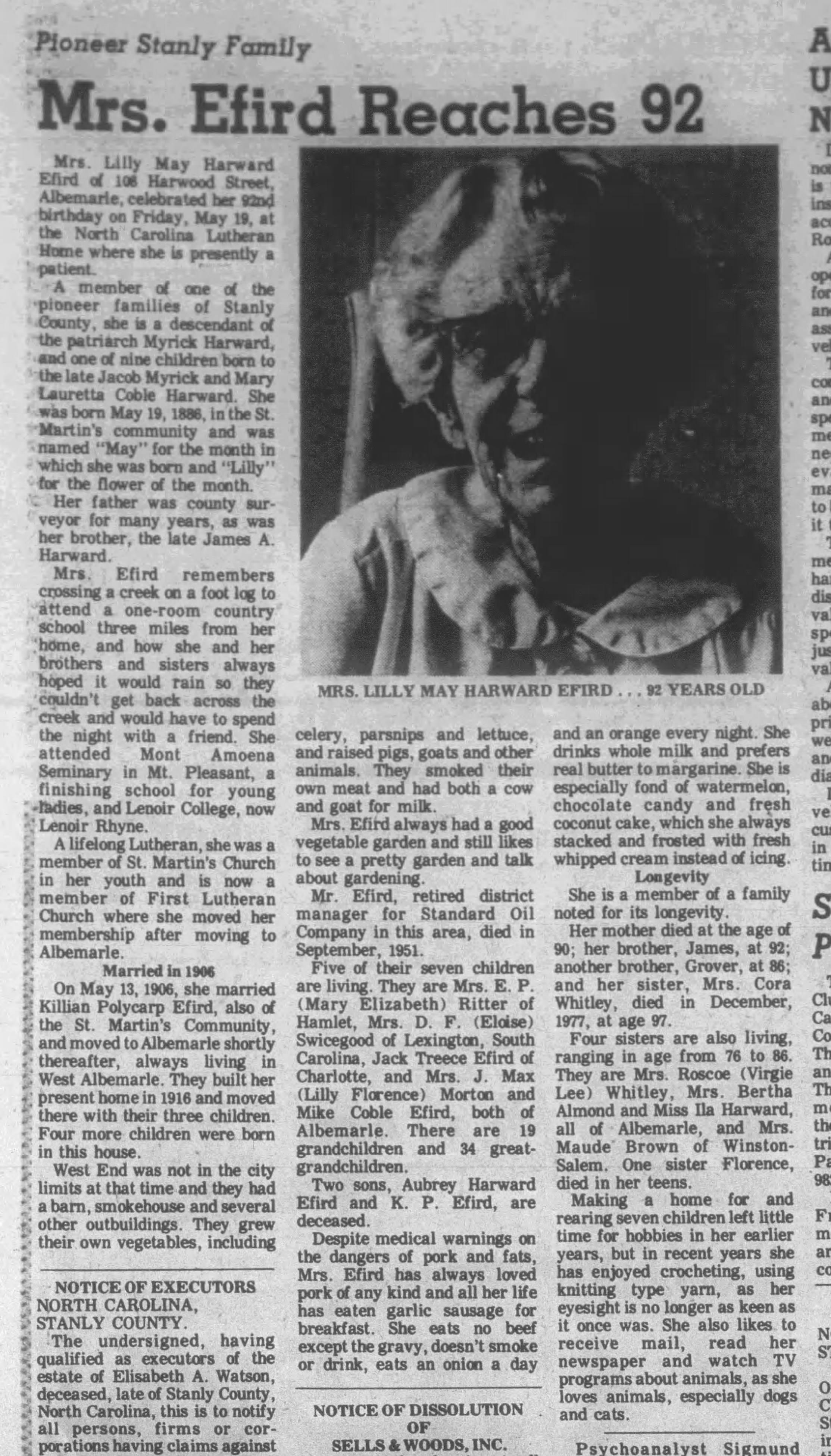 Funeral services for Mrs. Lilly May Harward Efird, 92, of 108 Harwood Street, Albemarle, were conducted at 2 o’clock Wednesday afternoon in First Lutheran Church, where she was a member. Rev. John M. Hawn, pastor, officiated, and interment was in Fairview Memorial Park, with graveside rites conducted by Rev. Dermont F. Swicegood.