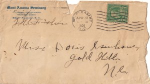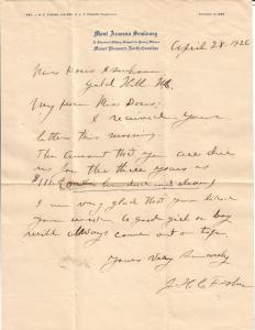 Letter from Mont Amoena principal, J. H. C. Fisher, to Doris Isenhour, 28 Apr 1926. From the Doris Isenhour Melchor Collection. Courtesy of Carla Melchor Ashton. Click on the images to enlarge.