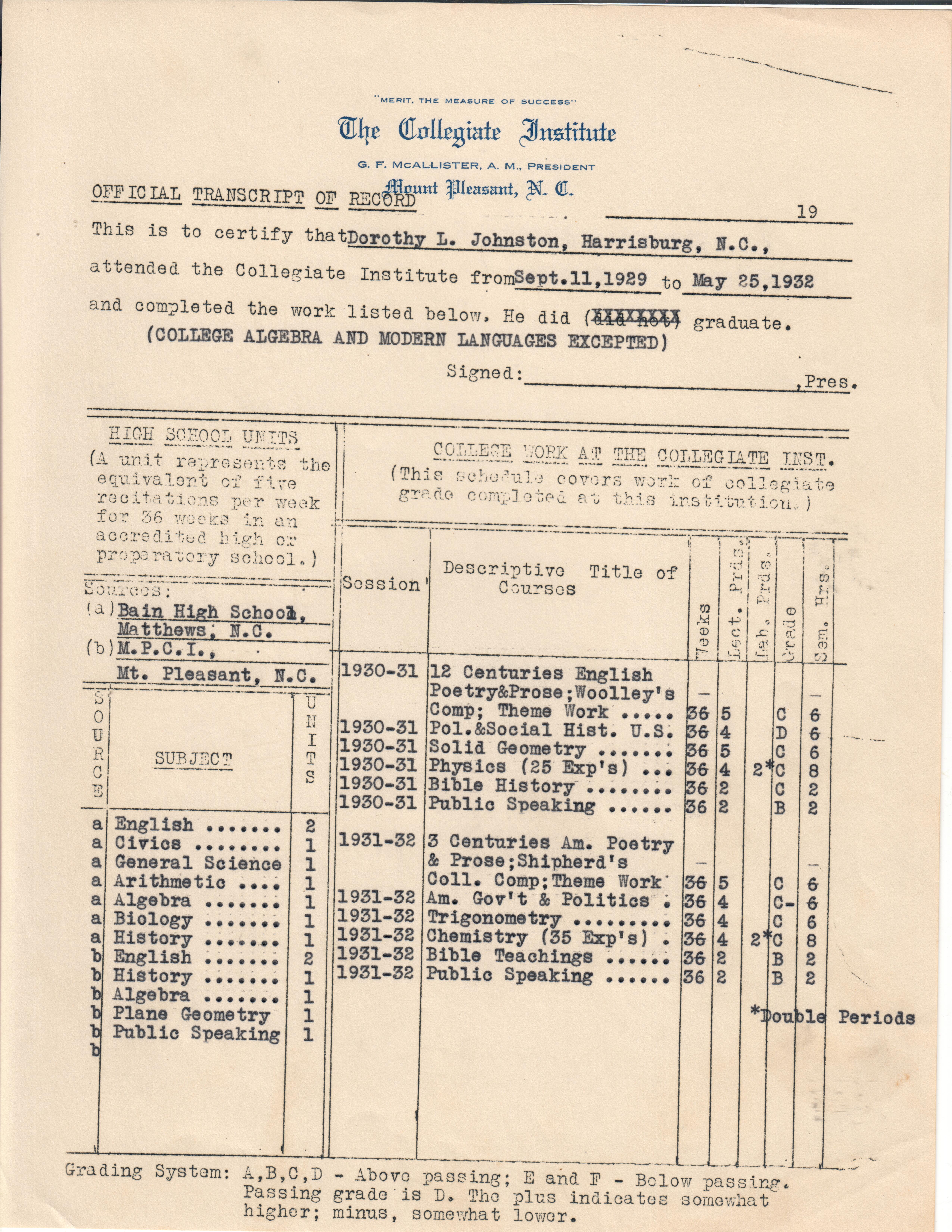 - Dorothy Lee Johnston, M.P.C.I. yearbook, 1932.
