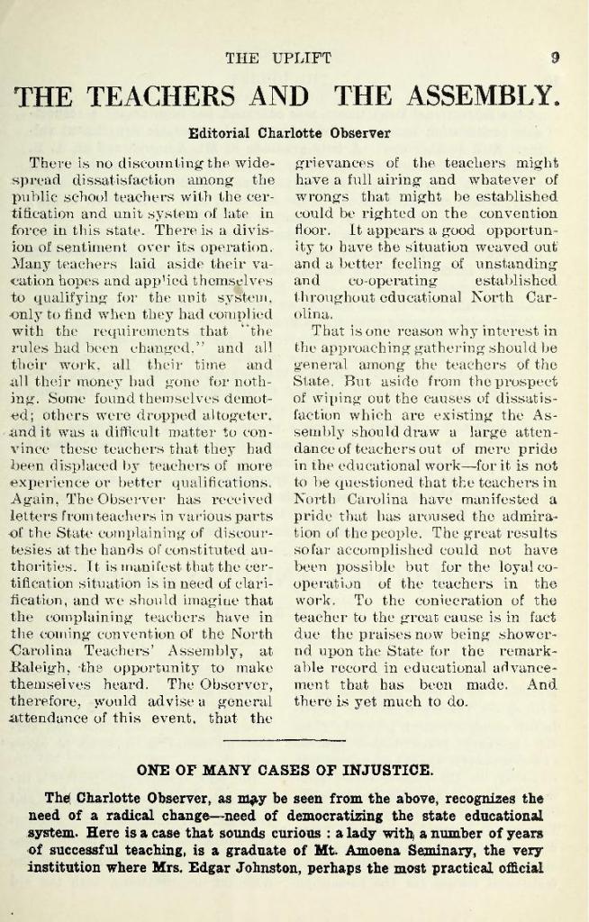 Mrs. Johnston had a wide background as an educator, having be educated in the Salisbury city schools and Catawba College at Salisbury. She was a teacher and supervisor in the Salisbury city schools for a number of years and was on the State Board of Examiners. At one time, she was assistant of professor of education at Catawba College.