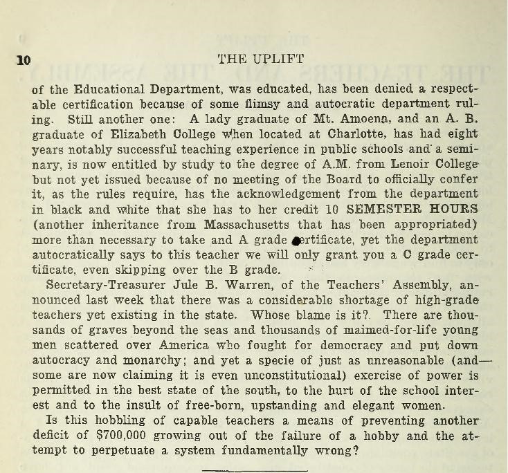 As member of the state board of examiners and institute conductors created by the 1917 general assembly, her work of teaching teachers carried her to the uttermost parts of the state and moved her state leader, Dr. James Yadkin Joyner, to the ultimate in praise, “A great teacher,” Dr. Joyner, acknowledged prince of the pedagogues, pronounced her in her work with the state.