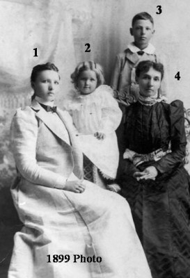 1899: 1. Olive Goodman Carpenter Johnson (daughter of Rose); 2. Gertrude Carpenter Cooper (daughter of Olive); 3. Harvey Goodman (son of Rose); Rose E. Ludwick Goodman Langan. Photo courtesy of Joe D. Valcik, www.findagrave.com, #108678000.