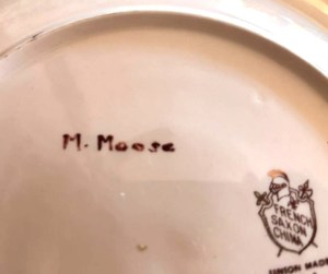 Handwritten note from an unidentified author (possibly cousin Virginia McAllister Smith) designating hand-painted china pieces belonging to Mabel McAllister Moose, dated September-October 1982. From the Julia Ethelyn Crabtree McAllister collection. See below for transcription.