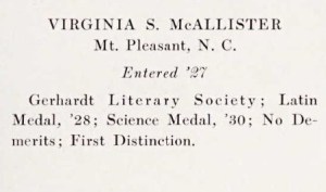 - Virginia McAllister, Gherhardt Literary Society. The Recall, 1932 M.P.C.I. yearbook, digitalnc.org.