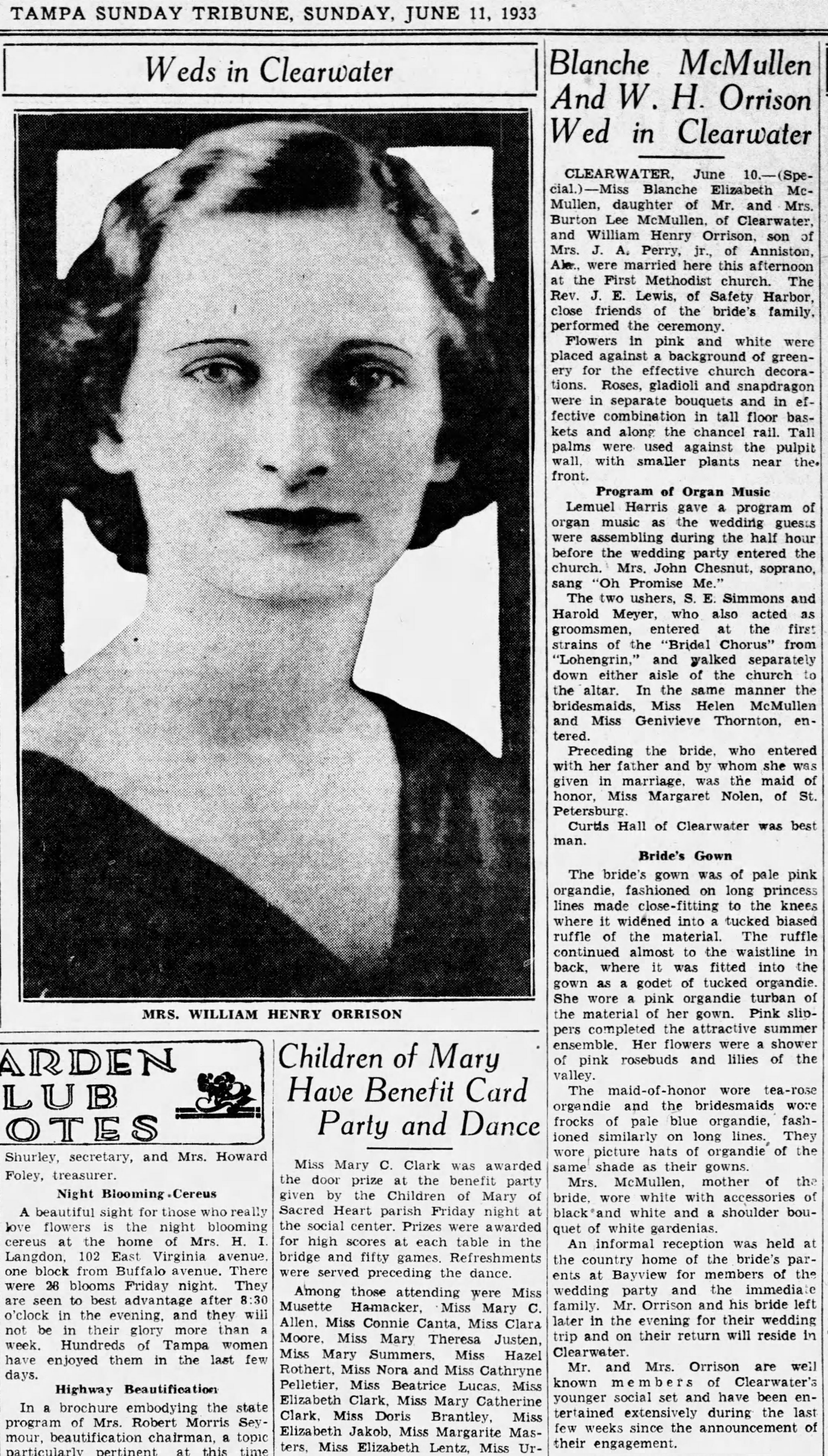 BIRD, MRS. BLANCHE MCMULLEN, 56. 511 Florida Ave., Clearwater, Saturday (May 29, 1965) at her residence. Born in Clearwater. Former owner of the House of Flowers. Member of the Episcopal Church of the Good Samaritan. Survived by a son, Perry Orrison, in California; a brother, Hugh S. McMullen, Clearwater. Moss Lakeside Chapel, Clearwater.