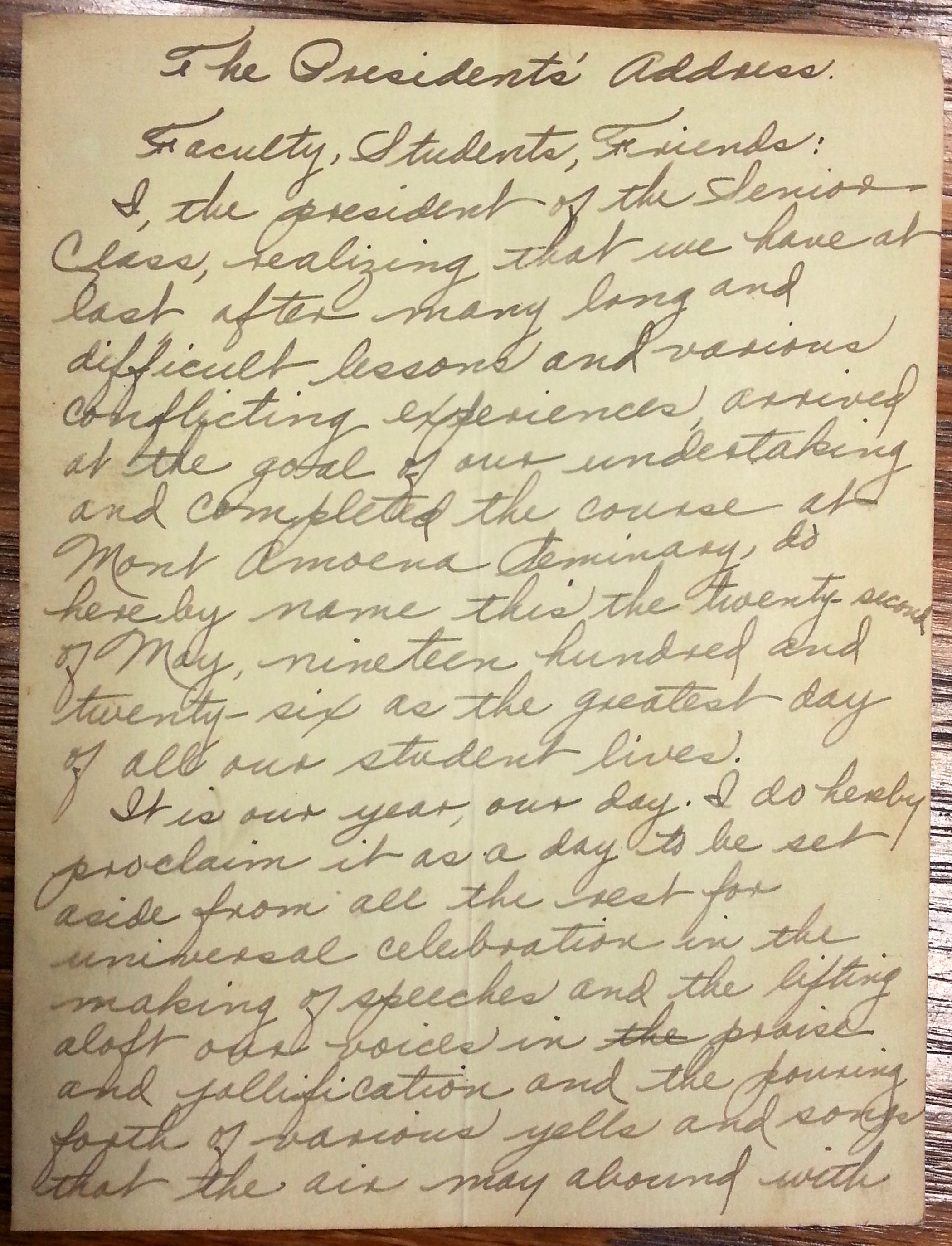 I, the president of the Senior Class, realizing that we have at last after many long and difficult lessons and various conflicting experiences, arrived at the goal of our undertaking and completed the course at Mont Amoena Seminary, do hereby name this the twenty second of May, nineteen hundred and twenty-six as the greatest day of all our student lives.