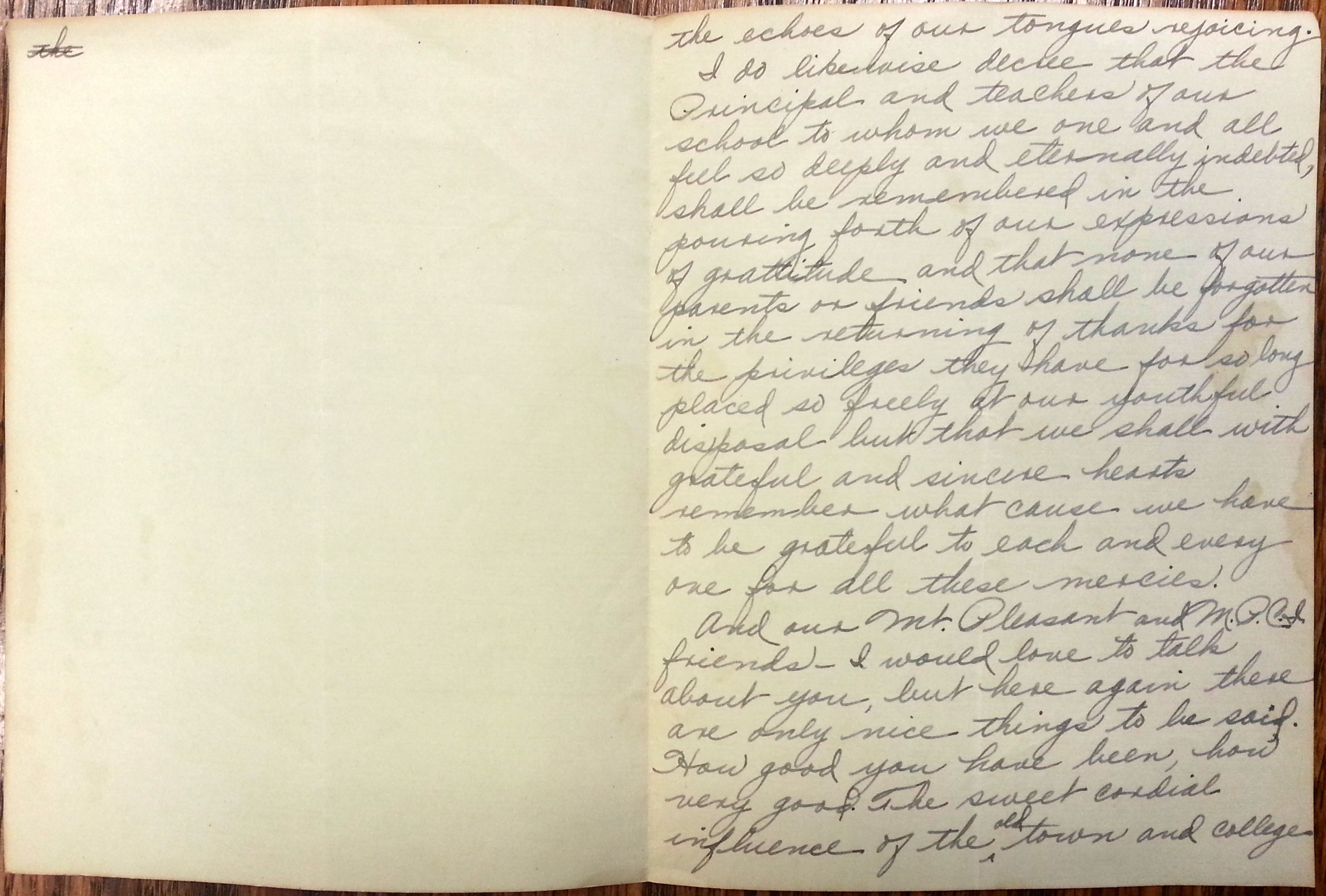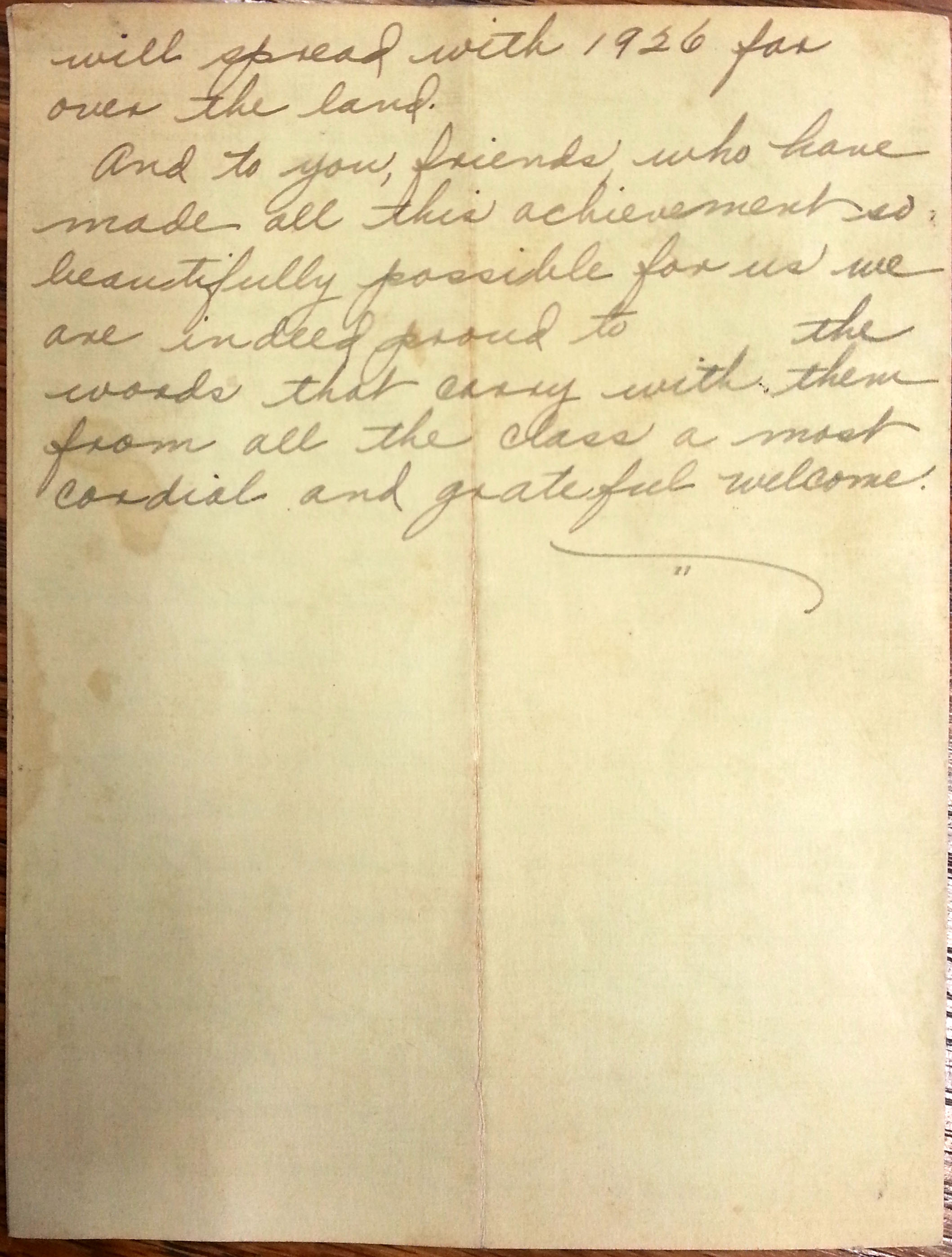 And our Mt. Pleasant and M.P.C.I. friends – I would love to talk about you but here again there are only nice things to be said. How good you have been, how very good. The sweet cordial influence of the old town and college will spread with 1926 far over the land.