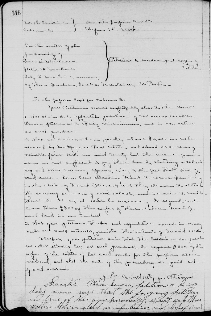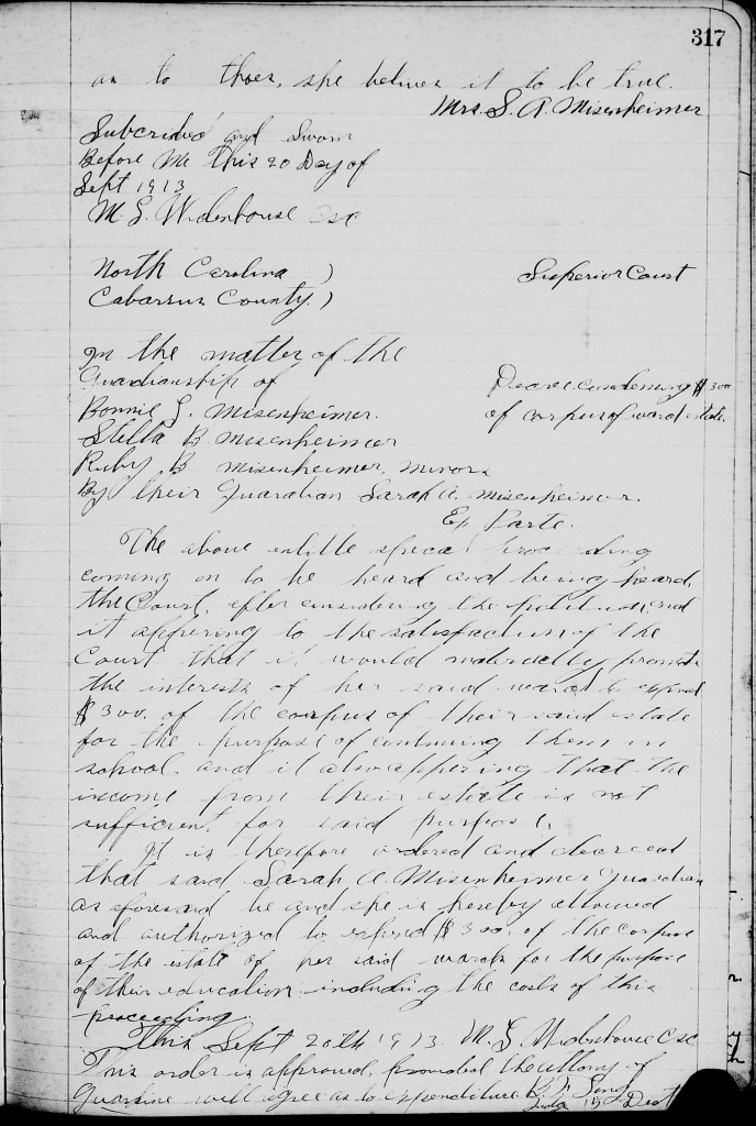 In September 1913, Sarah, acting as the guardian of her minor children, petitioned the Superior Court of Cabarrus County for permission to use $300 from her children’s estate to support their education in the Mount Pleasant schools. She cited the inadequate income generated by their holdings and emphasized the educational necessity. The court agreed that the expenditure would serve the children’s best interests, and the petition was approved. The following are from the collection Cabarrus. Court Records 1909–1912, 1912–1916, http://www.familysearch.org.
