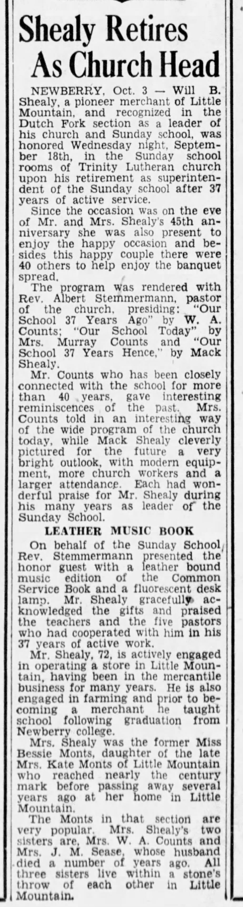 NEWBERRY, Sept. 27 – Mr. and Mrs. W. B. Shealy observed their golden wedding anniversary Wednesday afternoon, September 19, at their home in Little Mountain with open house. They were assisted in receiving by the surviving members of their weening party of 50 years ago. They are Mrs. Crosson Sease of Lexington, Mr. Shealy’s sister; Miss Toy Lathan of Columbia and Miss Cora Shealy of Little Mountain.