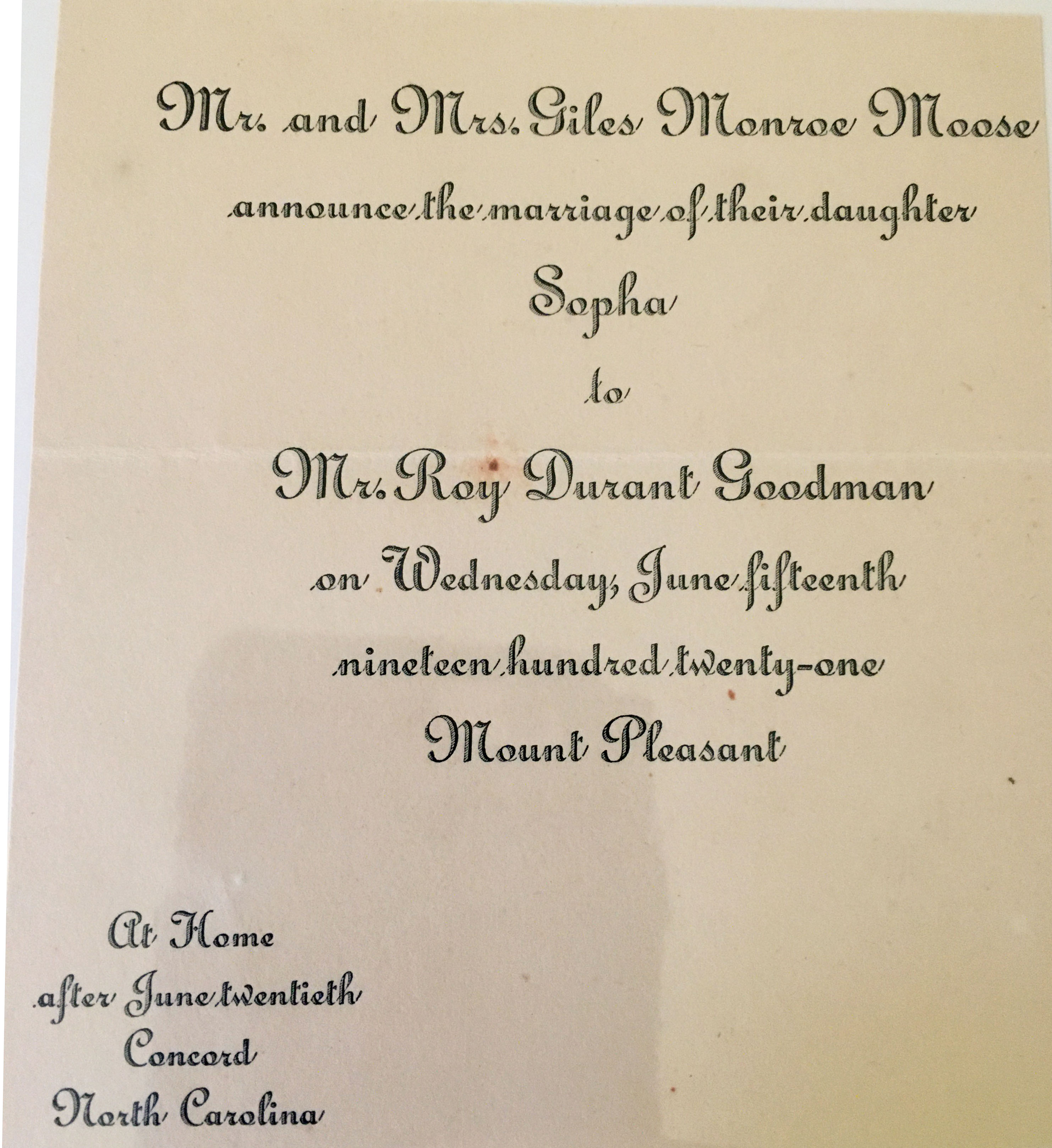 Wedding announcement of Sophia Moose and Roy Durant Goodman. Image: Courtesy of granddaughter Anita Howell.