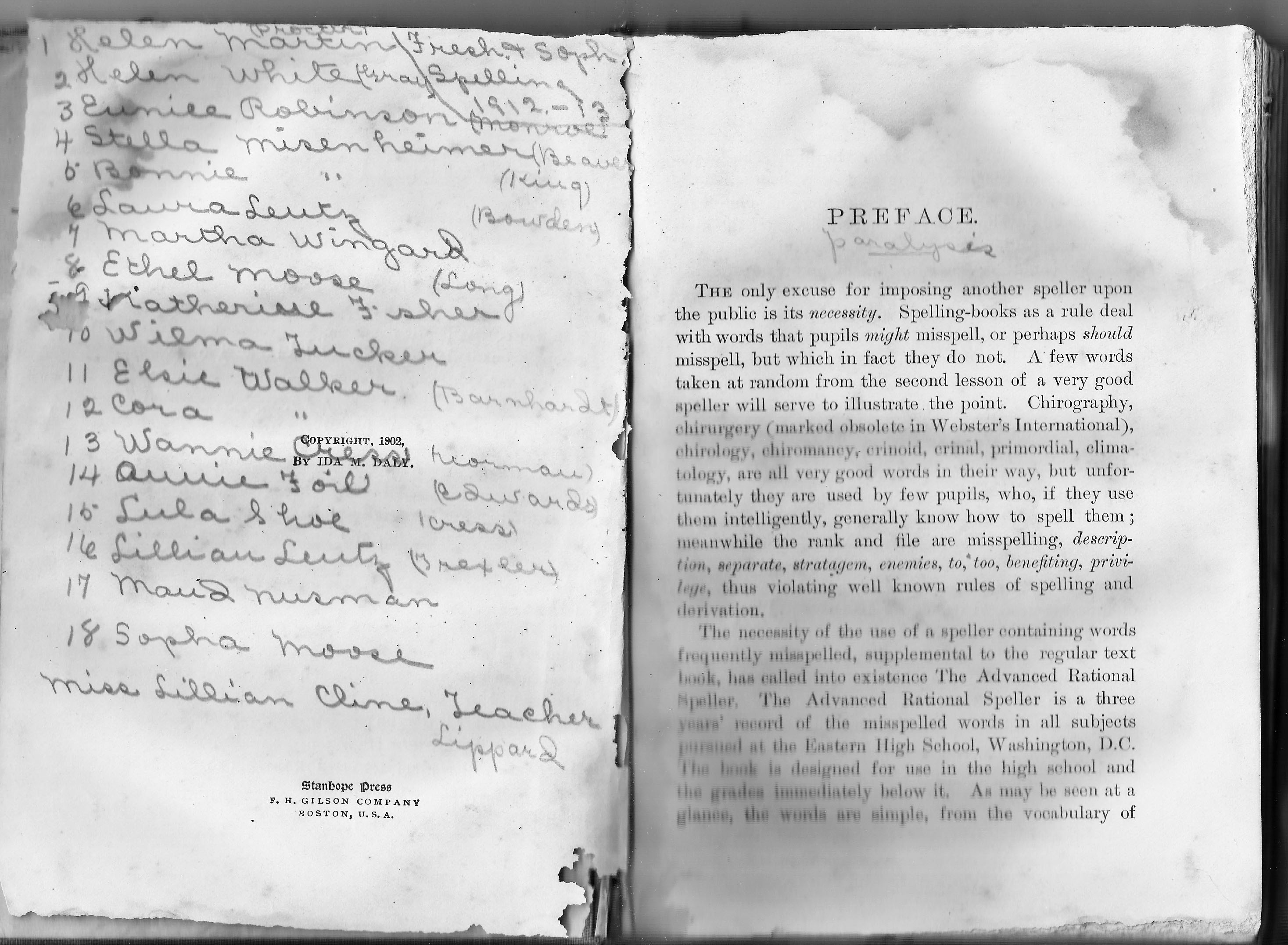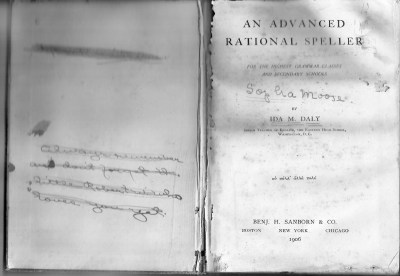 The freshman-sophomore speller of Sophia Moose, 1912-1913. The crossed out note on the left says, “Always remember and don’t forget the little Robert W. who loves you yet.” Photo: Bill Bingham, Jr., grand-nephew of Sophia Moose.