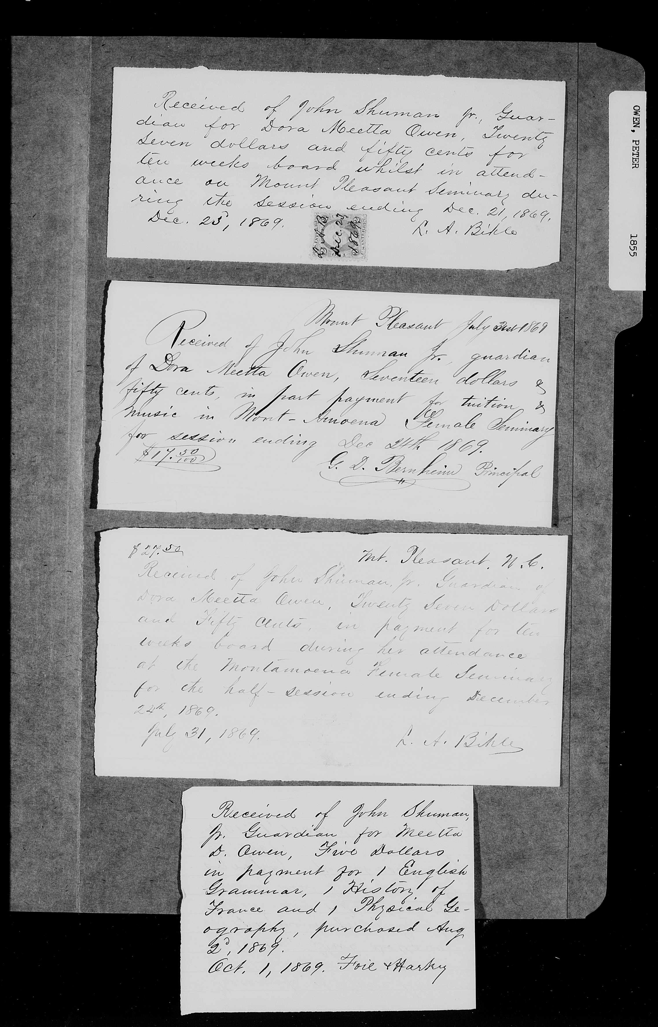 Receipts for attendance at Mont Amoena, July-December 1869. From the estate file of Peter Owen, father of Dora Meeta Owen. Her maternal grandfather, John Shuman, served as guardian. Received by G. D. Bernheim and L. A. Bickle. Estate Records: Rowan. Probate Estate Case Files 1663–1978, FamilySearch.org.