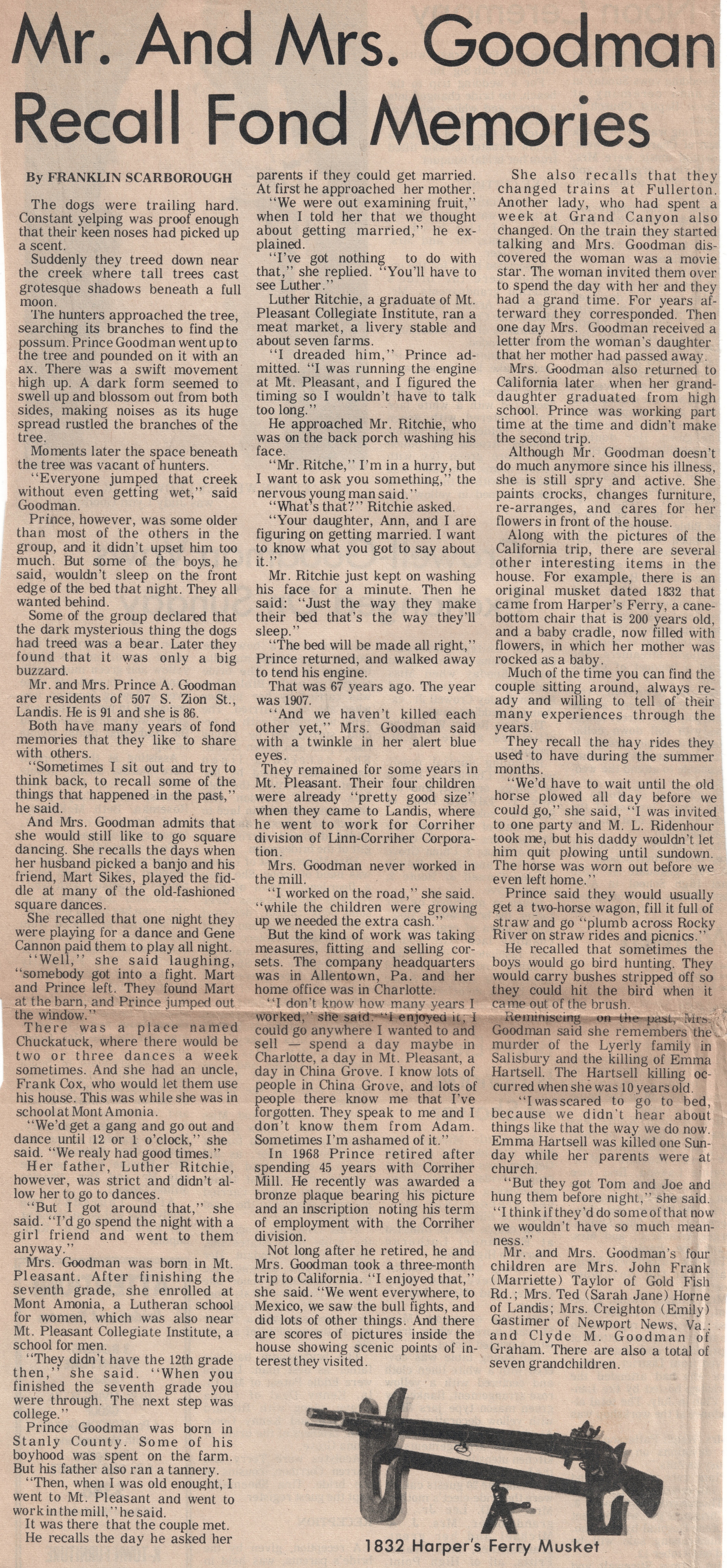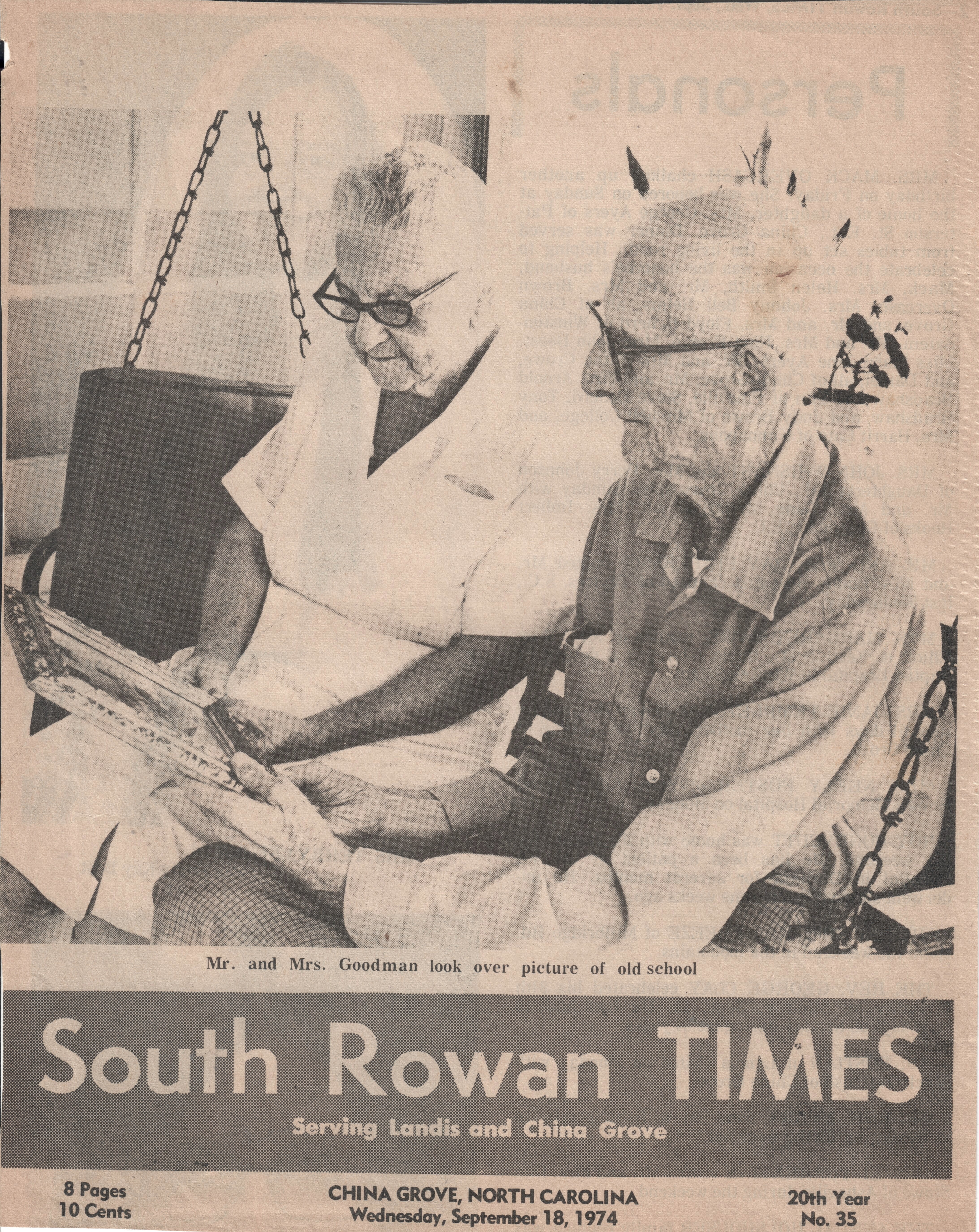 Mrs. Goodman was born July 25, 1888, in Cabarrus County, the daughter of the late Luther Ritchie and Mrs. Sara Cox Ritchie. She attended Mont Amoena Lutheran Seminary and was the oldest member of Trinity Lutheran Church, where she was a life member of the L. C. W. She was also an honorary member of the Landis Woman’s Club, a War Mother and member of the Eastern Cabarrus Historical Society. Her husband, Prince A. Goodman, died Jan. 6, 1976.