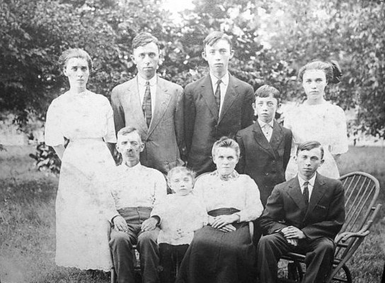 Top left: Mittie Shoe Peeler, Arthur Shoe,Irvin Monroe Shoe, Robert Shoe, Lula Bell Shoe and sitting on left Jefferson Davis Shoe, Mary Shoe, Wife Anna Elizabeth Page Shoe, Burley Shoe, c. 1908. Ray Peeler, http://www.findagrave.com.