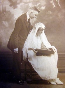 The bride was beautiful in her wedding gown of white satin and georgette her veil falling from a wreath of forgetmenots. She carried a shower bouquet of sweet peas. The bridesmaids carried elaborate bouquets of pink sweet peas with pink tulle.