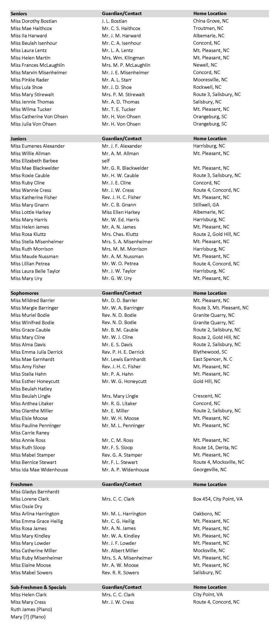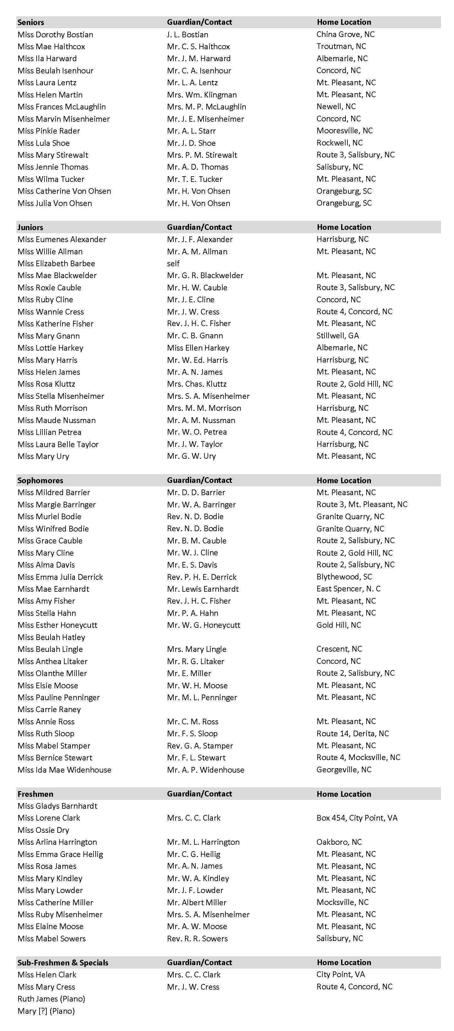 The following is the 1915-1916 student roll list for Mont Amoena Seminary, Mount Pleasant, NC. The Sub-Freshmen and Special Students found at the end of the list may not have been single young ladies, in which case the person named in the parent column may be some other relation. Names are recorded as found. From microfilm (R.01606017), North Carolina State Archives, Raleigh, NC. Courtesy of the Cabarrus County Public Library. To view a digital copy of the original, including each student’s quarterly grades, see: https://archive.org/details/ma.-rb.-1913-1917/page/n1/mode/2up.