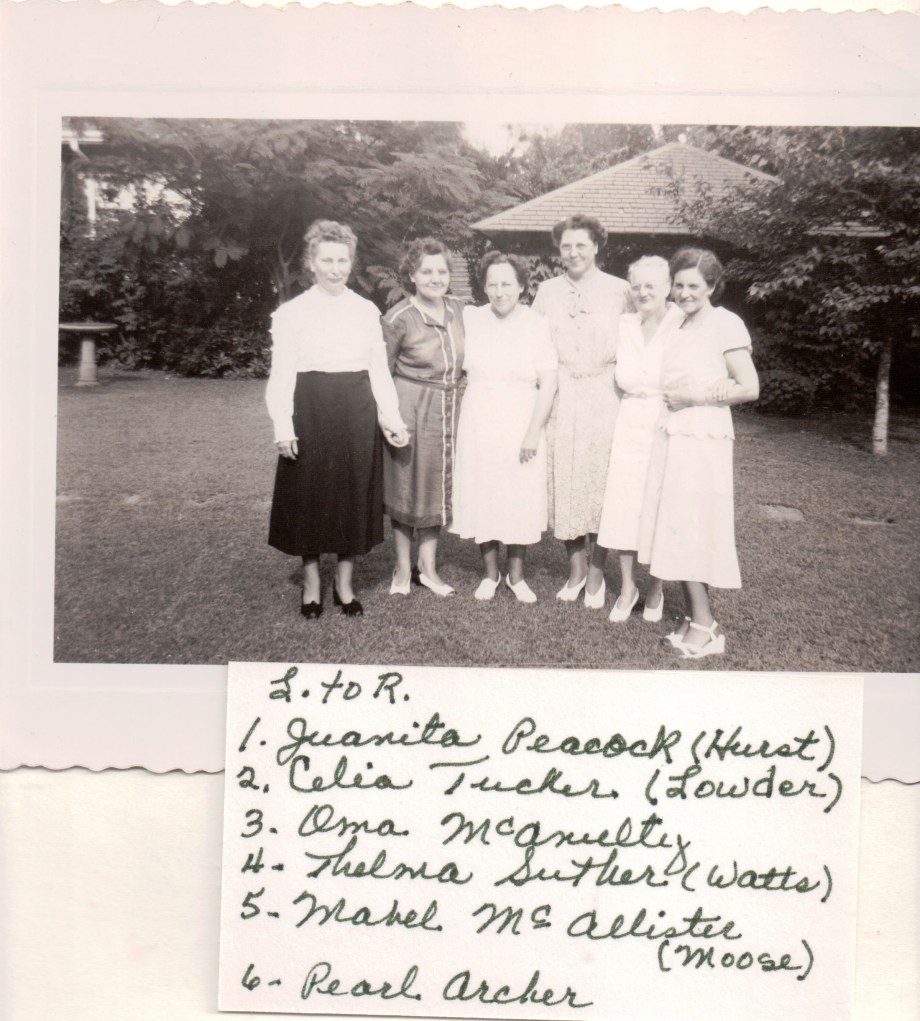 - 1951. This is mislabeled. It should be: 1. Mabel McAllister Moose, 2. Celia Tucker Lowder, 3. Ruth Barringer, 4. Thelma Suther Dellinger, 5. Pearl Archer Smith, 6. Juanita Peacock Hurst, 7. Ruth James, 8. Omey McAnulty Penninger, 8. Ruth Cress.