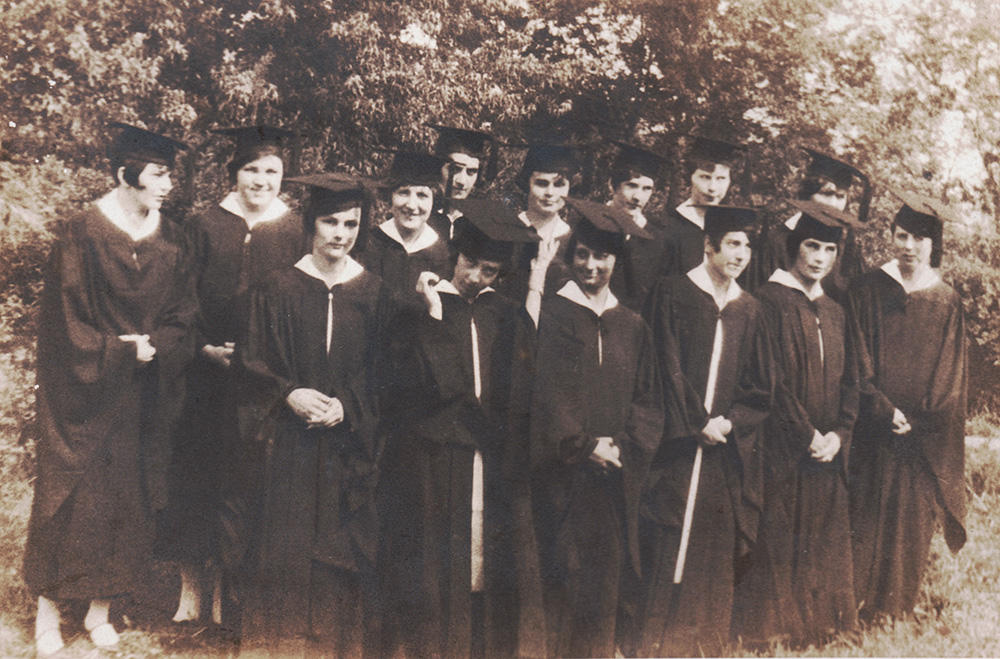 Mont Amoena class of 1927. Front row: Frieda Smith, Verna Mae Hahn, Jane Penninger, Ruth Lowder, Adele Anderson, Shirley Moose. Second row: Numa Cox, Virginia Cline, Mary Ella Barrier, Annie Pless, Ruth Barrier, Miriam Foil, Jessie Isenhour, Lenna Hahn.