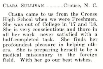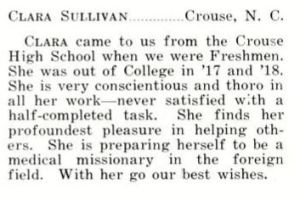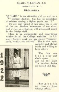 … The society assumed the support of Miss Clara Sullivan, Lincolnton, as missionary to China in addition to regular contributions. Pledges were given on the floor of convention and conferences with response that justifies the action. She will probably sail in September.